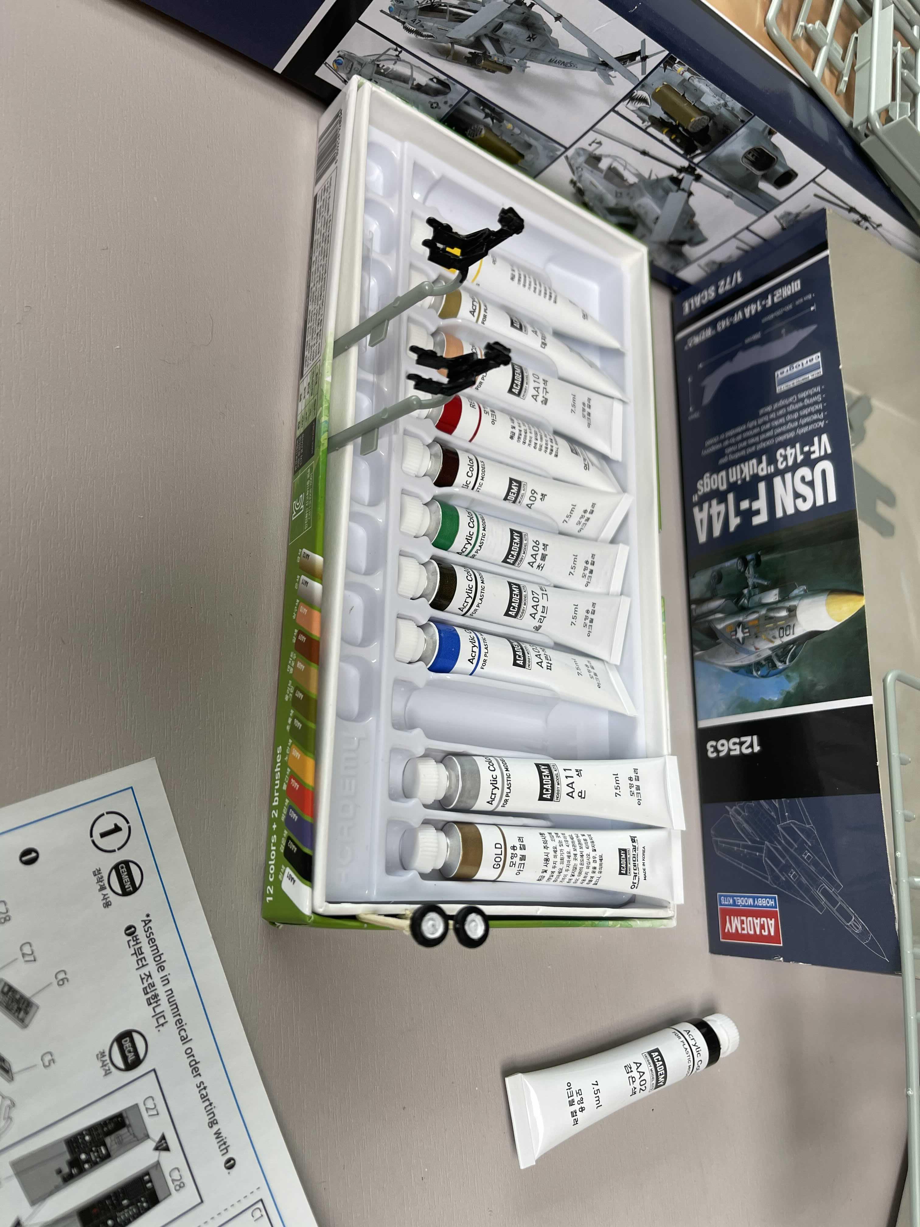 사실 집에서 시너 도색작업을 하는게 쉬운 일은 아니다. 접착제 냄새가 온집안에 퍼지면 매니큐어 바를 때 냄새와 똑같다고 구박을 받고 있었는데, 도색까지 하면 아마 등짝 스매싱이 날라올 것이다. 당연히 환기 장비를 갖추고 분진 흡입 배기 등등등등을 방구석에 만들어 놓아도 여래신장이 날라오겠지. 그렇다고 이 추운 계절에 밖에서 도색 작업하는건 좀 너무 아니라고 생각하던 와중에 마침 수성 아크릴 페인팅 킷이 있어서 사보기로 했다. 수성이라 일반 물감 처럼 튜브에 짜서 쓸 수 있으며 농도는 당연히 물로 조절한다. 용제가 물이라 당연히 냄새도 거의 없다.