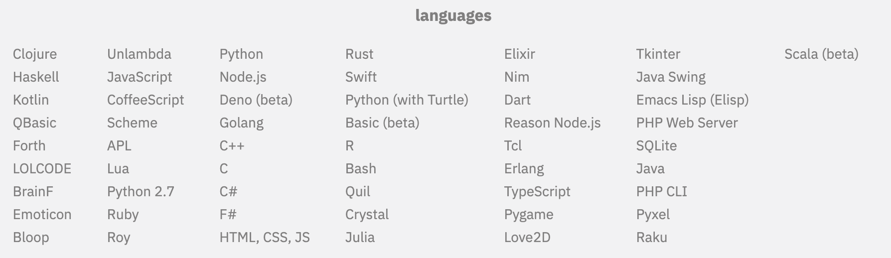 생각보다 많은 언어 환경을 제공하니 자신의 로컬이 각종 Runtime으로 더러워(?) 지는 것을 혐오하는 사람들은 이용을 추천한다.