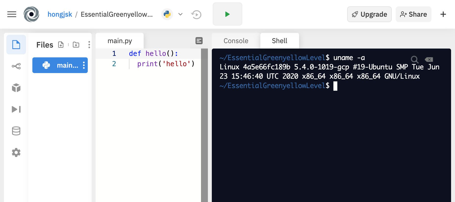나는 python runtime을 선택했는데, shell에서 정보를 확인하면 Ubuntu Linux를 기반으로 하는 Shell을 제공하는 것으로 볼 수 있다.