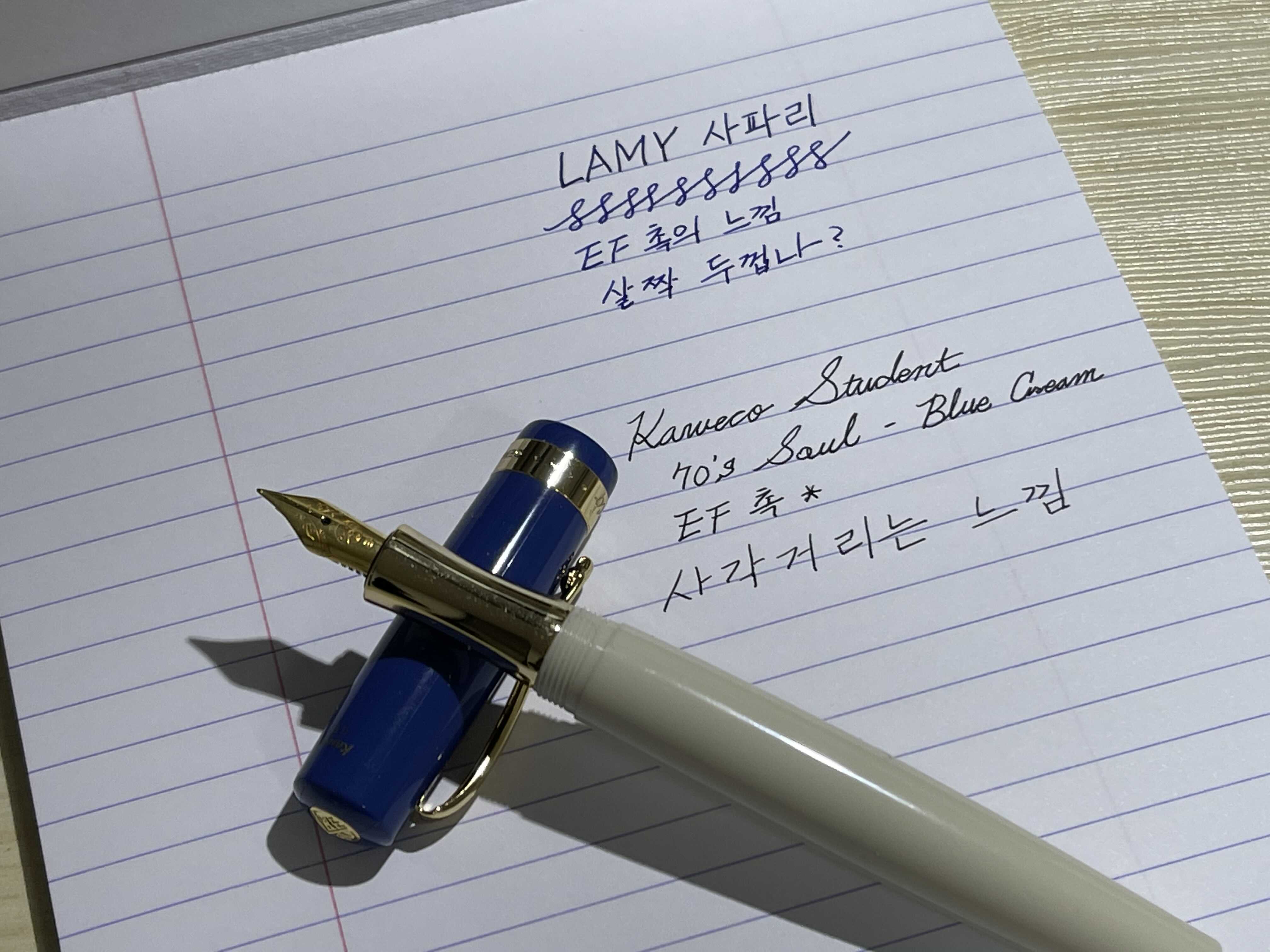 기존에 가지고 있던 LAMY 사파리도 EF, 이번 카웨코도 EF. 둘 다 독일산이고 EF촉인데, 라미가 약간 더 두꺼운 느낌이다? 이에 반해 카웨코는 좀 더 사각거리는 느낌이 강하다! 그리고, 만년필 캡(뚜껑)을 결합하면 무게 중심이 뚜껑 쪽으로 몰리는 느낌이 든다. 개인적으로는 결합하지 않고 사용하는 느낌이 더 좋긴 하지만 이게 펜에 피해서 손이 커서 그런건지는 잘 모르겠다.