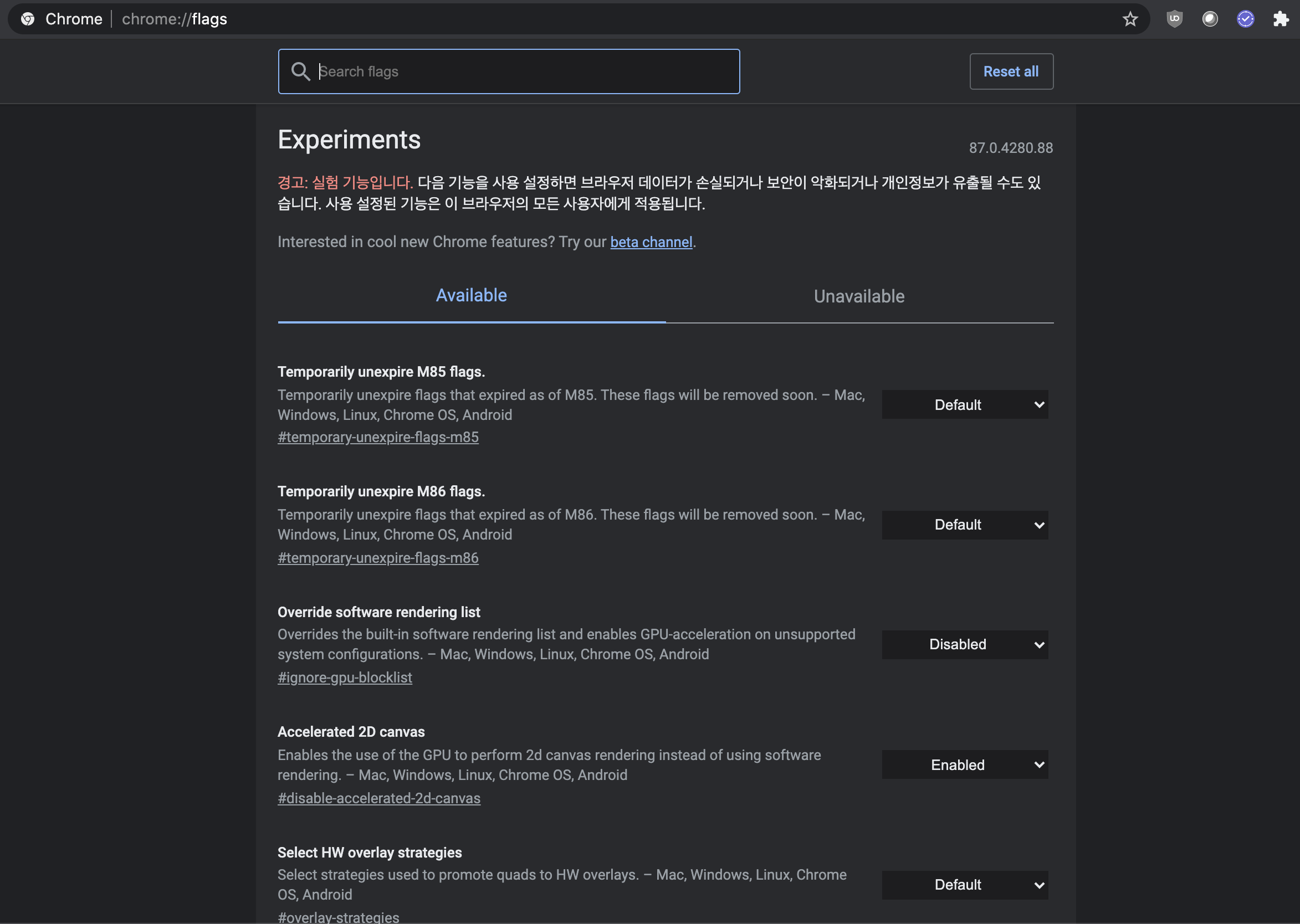 chrome://flags/입력하면 이렇게 다양한 기능을 설정으로 제공한다.