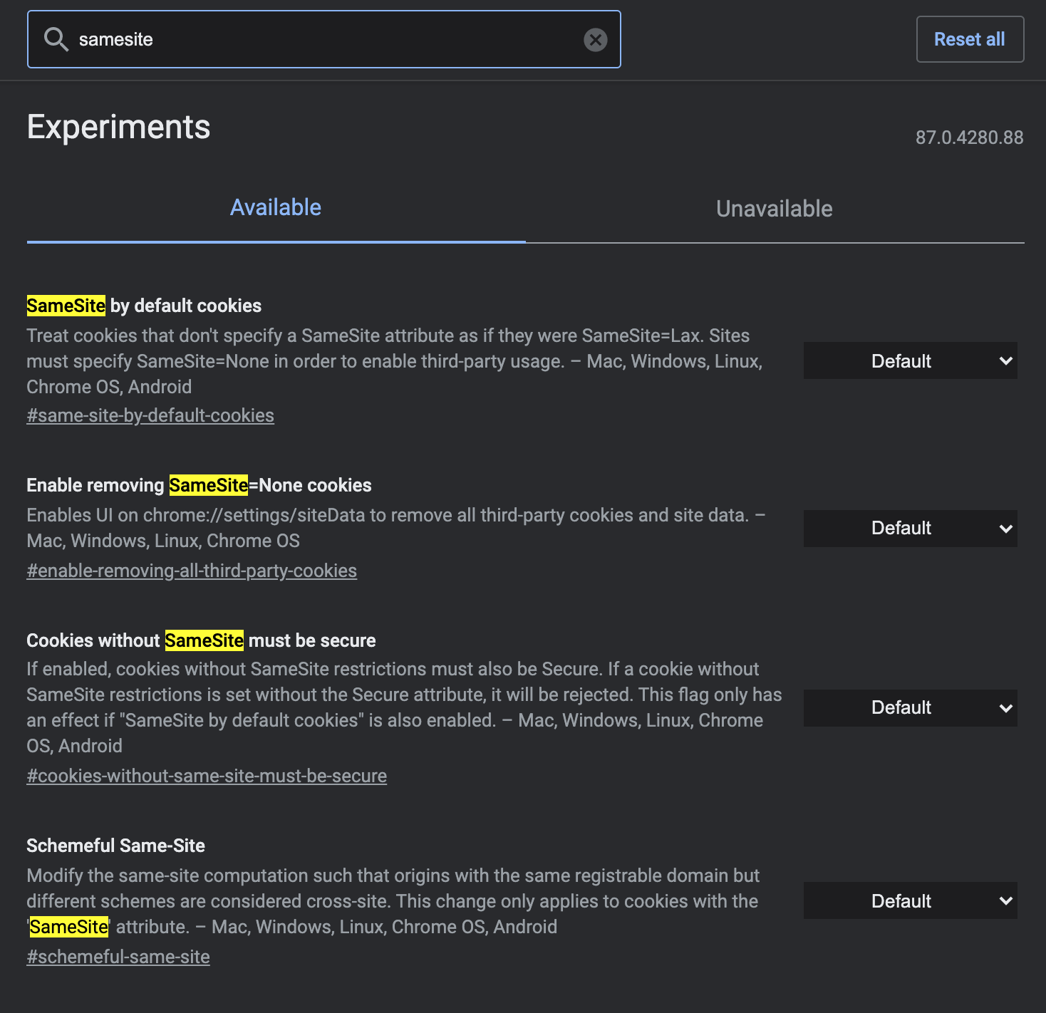 Search flags 에 samesite라고 입력하면 여러가지가 검색되어 나온다.