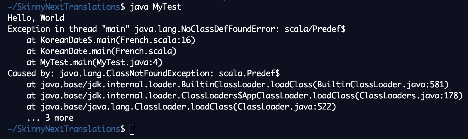 public class MyTest { public static void main(String[] args) { System.out.println("Hello, World"); KoreanDate.main(args); } }그리고 Shell에서 javac MyTest.java 그리고 java MyTest 명령으로 실행하면 다음과 같이 오류가 발생한다.