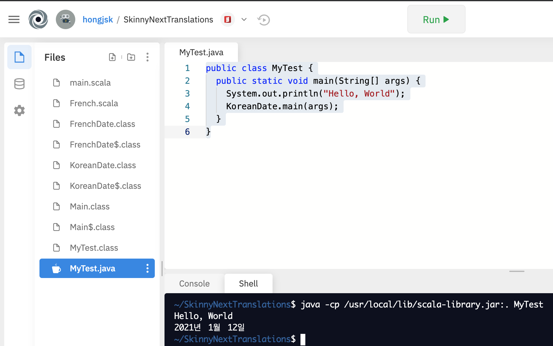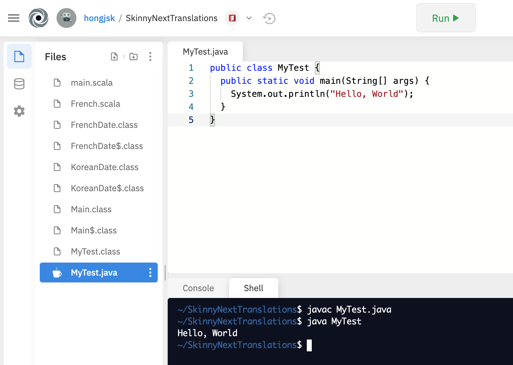 public class MyTest { public static void main(String[] args) { System.out.println("Hello, World"); } }repl.it의 Shell 화면에서 javac Test.java 명령을 실행하면 Java 코드가 컴파일되어 MyTest.class가 생성되는 것을 볼 수 있다.