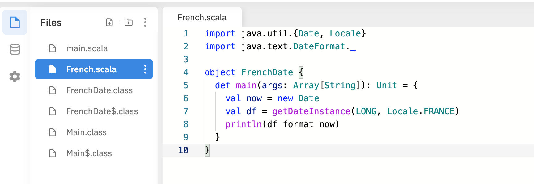 Scala로 만들어진 코드는 scalac 명령으로 컴파일 할 수 있다. FrenchDate라는 클래스를 만들어내는 소스 코드의 French.scala FrenchDate가 정의되어 있으며 scalca로 컴파일하면, FrenchDate.class가 생성되는 것을 볼 수 있다. 이는 Scala가 가진 특징으로 Source에 정의된 Object를 기반으로 Class를 생성하기 때문이다.