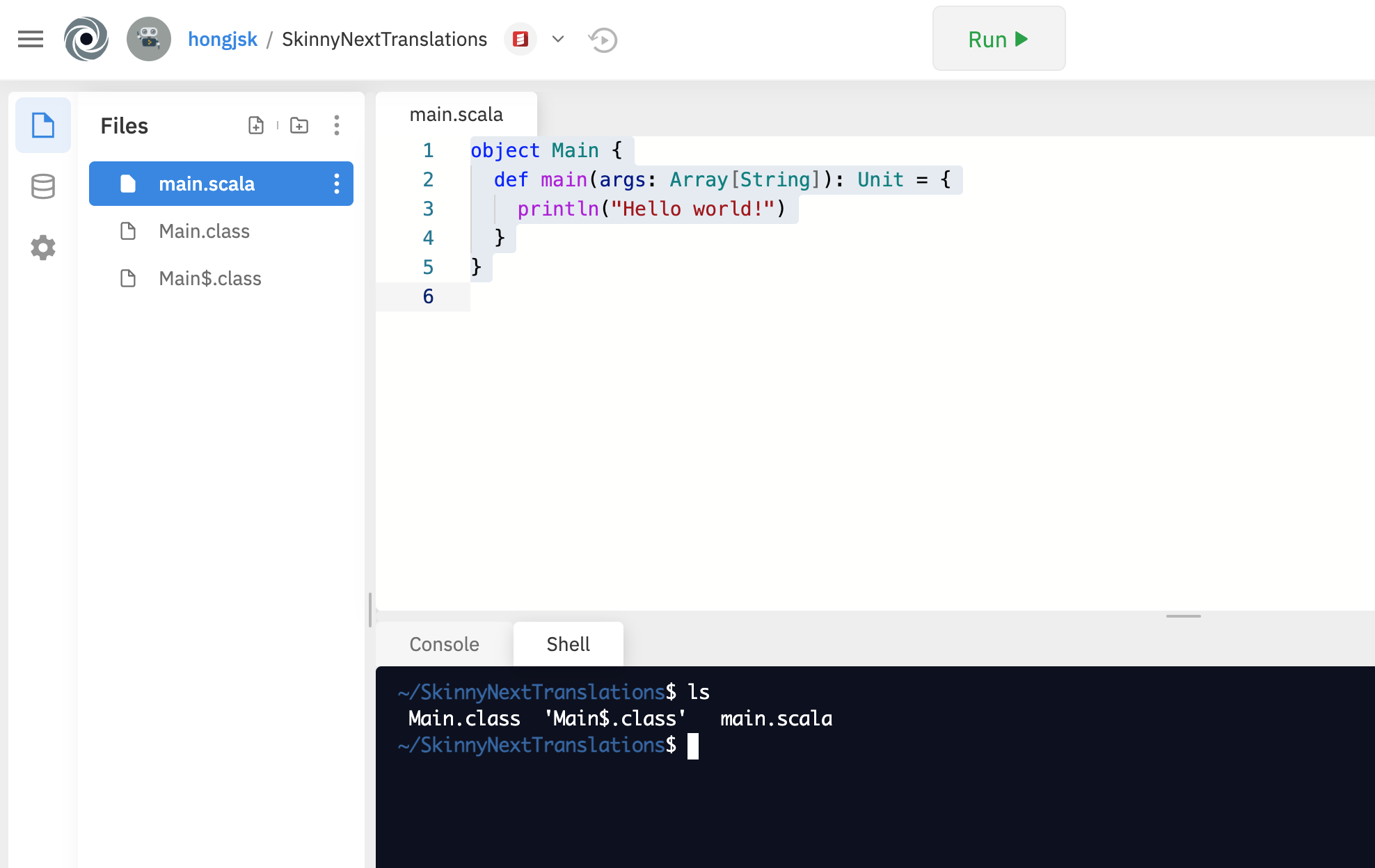 object Main { def main(args: Array[String]): Unit = { println("Hello world!") } }일단 눈에 띄는 특징으로 Java 클래스를 시작하는 method인 static main 함수가 없다. 또한 파일 확장자가 .java가 아니라 .scala이며 컴파일도 javac가 아닌 scalac로 한다.