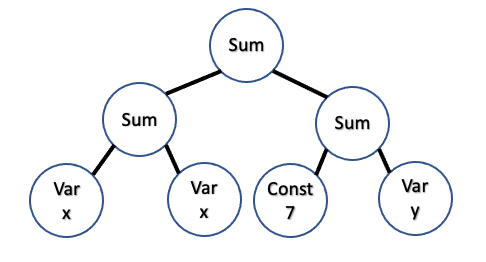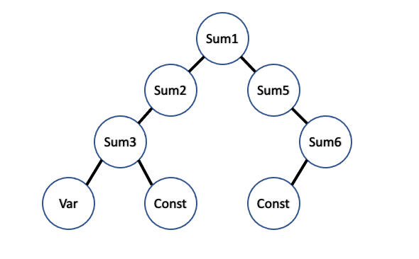 이 Tree의 최상단 노드인 Sum1을 eval하는 것으로 시작하며 Sum1의 경우 l을 Sum2, r에 Sum5로 놓고 다시 eval을 호출한다. 그렇게 타고 내려가다 Leaf Node인 Var에 도착하면 String으로 되어 있는 정보를 Int로 변환하는 Environment 타입의 Callback을 실행하여 정수 값을 리턴하고, Const의 경우는 원래 정수 형이었기 때문에 가지고 있는 값을 그대로 return한다. 그러면 Sum3의 left, right node의 eval() 실행 결과를 얻게 되므로 두 값을 합친 후 return하여 상위 노드로 되돌아가게 된다.