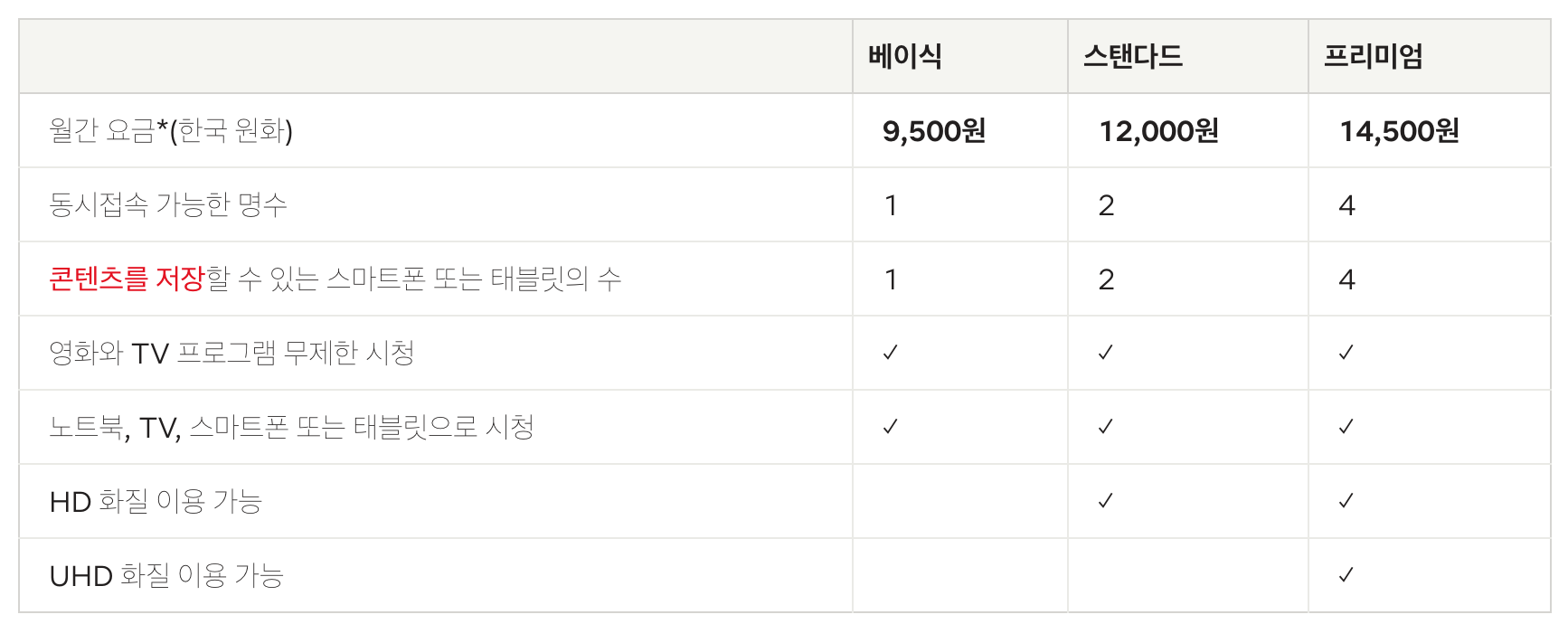 근데, 요금제의 차이가 단지 화질의 차이만 있는 것은 아니다. 중요한 것이 있는데 바로 동시 접속 가능한 명수다. 베이식 요금제 사용자의 경우 계정당 1명만 접근 할 수 있고, 스탠다드는 2명, 프리미엄은 4명이 가능하다.