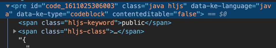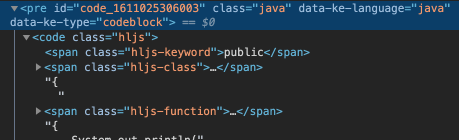 블로그 글보기 화면에서 Code 블럭에 대한 Element 음. 편집화면과 글보기 화면의 tag가 달라 hljs가 다르게 적용된 것을 볼 수 있다. 이게 서로 다르게 보이는 가장 큰 이유로 보인다.