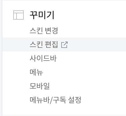 블로그 관리화면으로 가면 왼쪽 관리 메뉴 중 꾸미기 기능이 있으며 하위에 스킨 편집 메뉴가 있다. 이를 클릭하여 테마/스킨 편집 화면으로 전환한다.