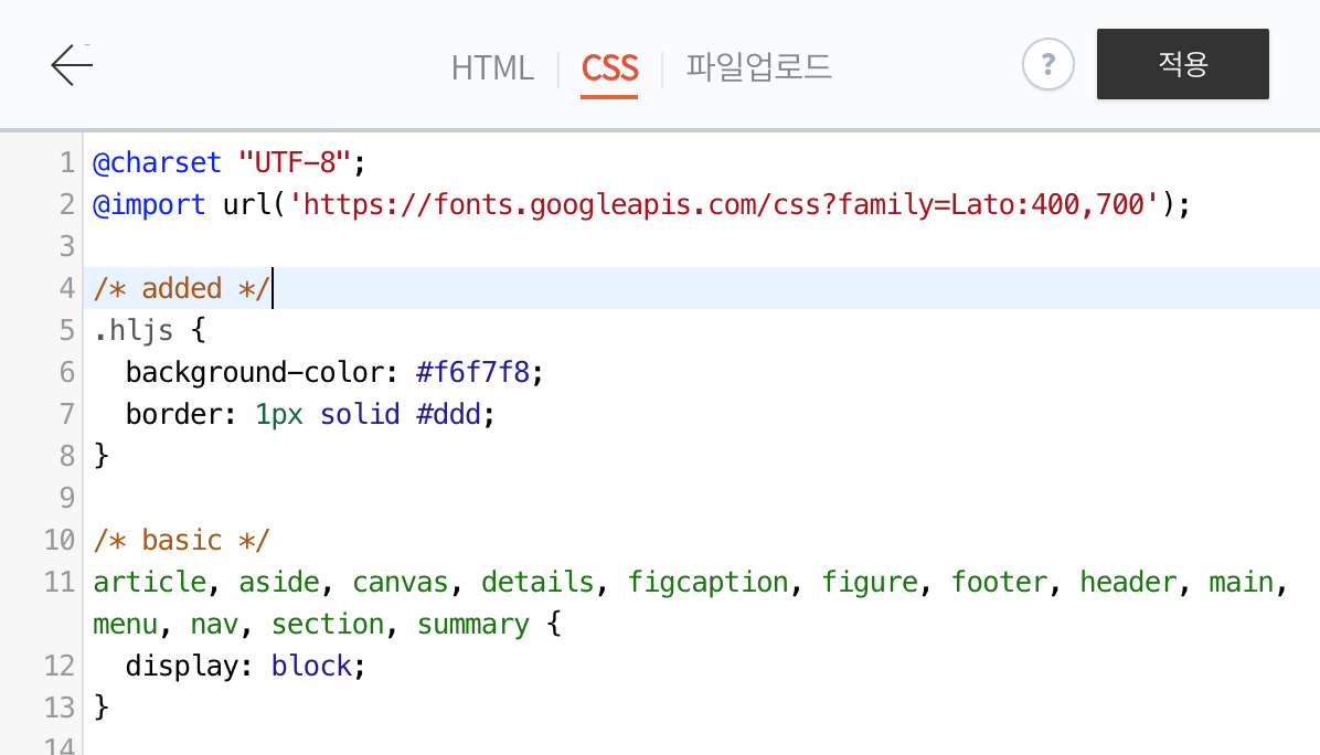우리는 CSS만 변경하면 되므로 CSS 탭으로 이동한다. 여기에 다음과 같은 내용의 스타일을 추가한다. 참고로, !important를 추가한 것은 background-color로 변경한 스타일의 우선순위가 낮기 때문에 강제로 적용하기 위해 추가해 준 것이다.