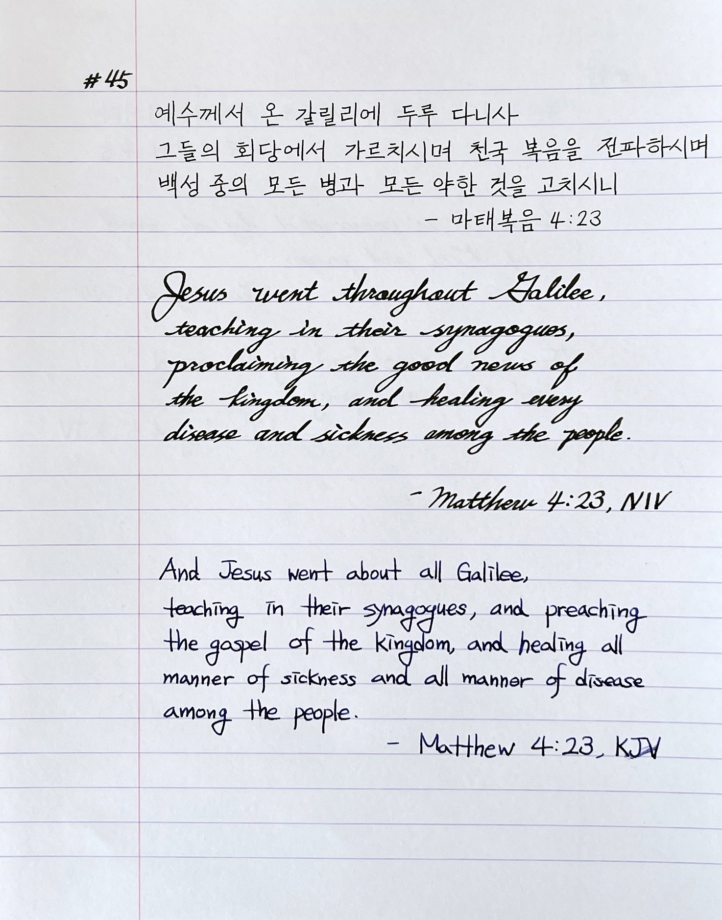 예수께서 온 갈릴리에 두루 다니사 그들의 회당에서 가르치시며 천국 복음을 전파하시며 백성 중의 모든 병과 모든 약한 것을 고치시니