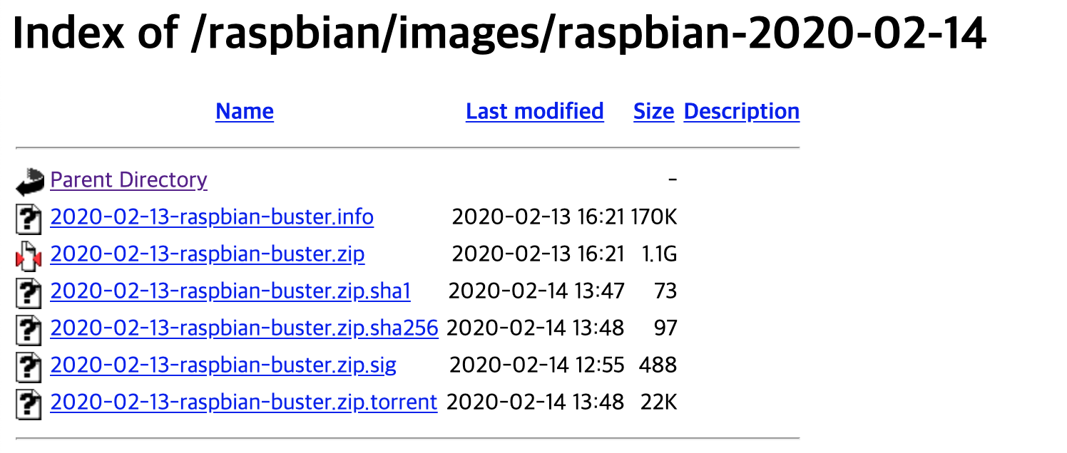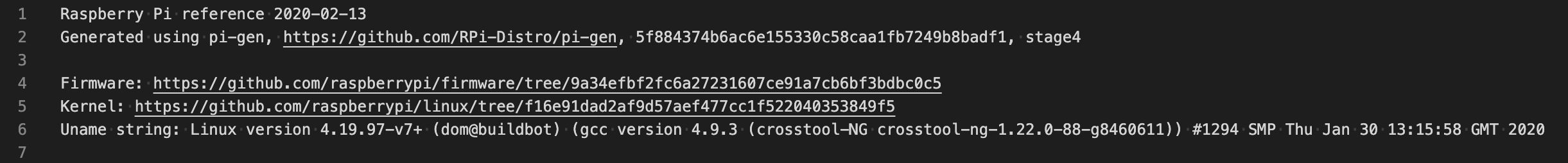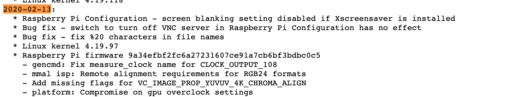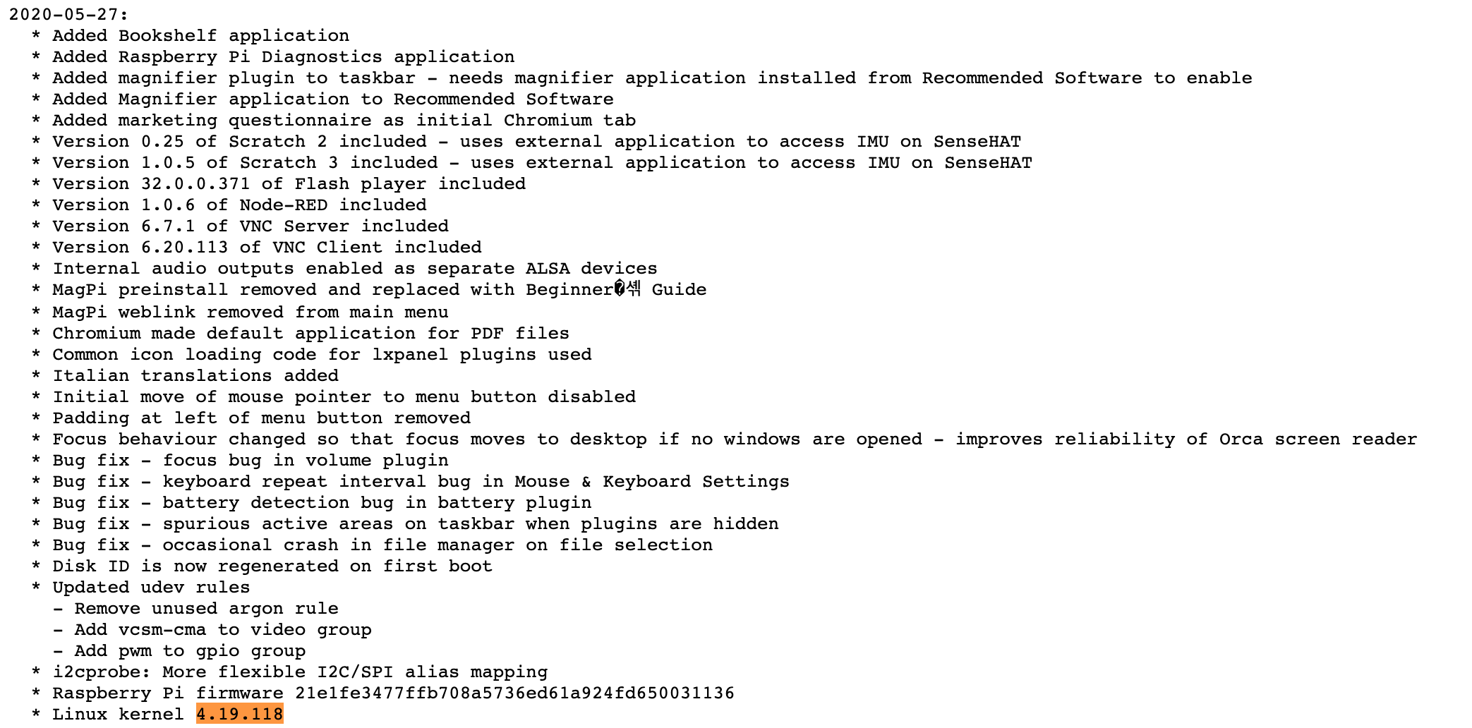 2020-02-14 raspbian 이미지 디렉토리 근데, 가장 마지막 버젼이 '2020-02-14' 밖에 안보인다. 어찌된 거지? 우선 2020-02-13-raspbian-buster.info 파일을 열어 내용을 확인해 보았는데, 4.19.97-v7+ #1294 였다. 현재 라즈베리파이 단말에는 4.19.118+ #1311 가 설치되어 있는데 뭔가 맞지 않는다.