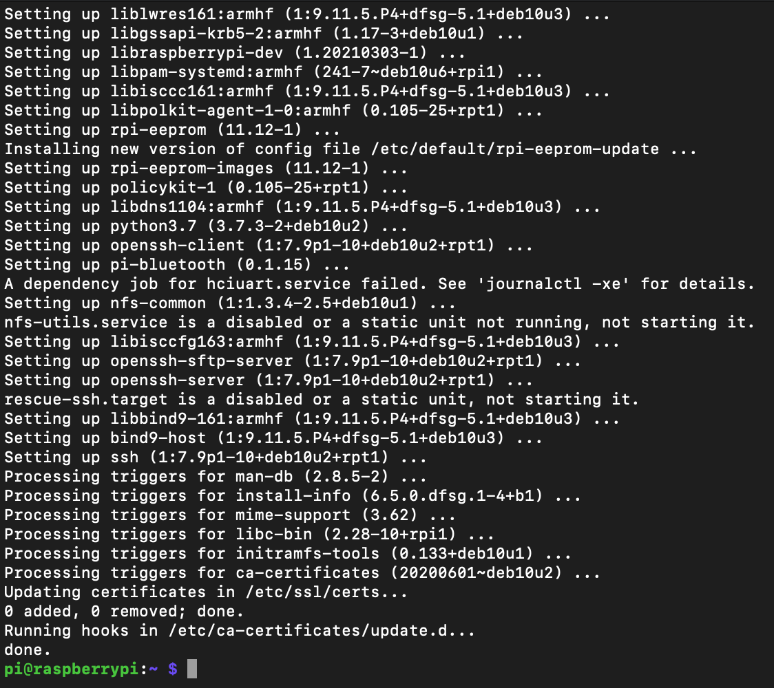 터미널에 접속했다면 이제 apt 명령을 이용해 보자. APT는 Advanced Package Tool로서 Debian 계열의 애플리케이션 패키지 관리자 소프트웨어이다. 업데이트 시 다음과 같이 update와 upgrade 두 가지 명령을 연달아서 실행하게 된다.