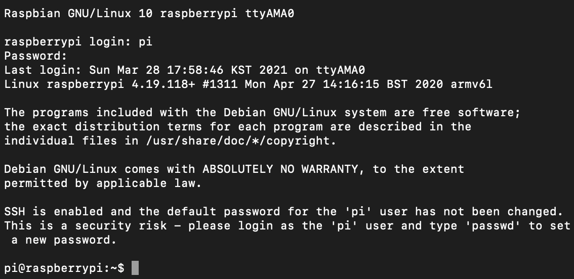 출처 : https://www.raspberrypi.org/documentation/raspbian/updating.md GUI Desktop이 아닌 경우 직접 접속 가능한 Terminal 화면에 ID와 비밀번호를 입력하여 로그인하게 된다.