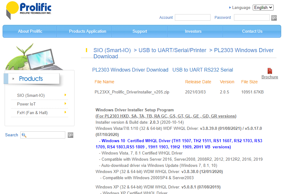 usb2serial 컨트롤러 이름이 PL2303 이므로 이를 검색해보면 Prolific PL2303 driver라는 것을 알 수 있다. 따라서, 이 드라이버의 제조사 홈페이지에서 다운로드 할 수 있었다.