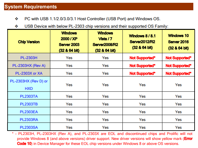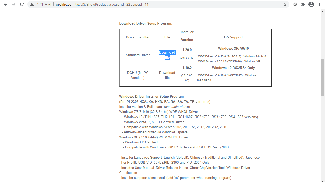 PDF 파일로 제공되는 PL2303 Windows Drive Manual v1.23.0.pdf 파일을 열어보면 PL2303 칩의 세부 버젼에 따라 지원하는 것과 하지 않는 것으로 나누어지는 것을 볼 수 있다.