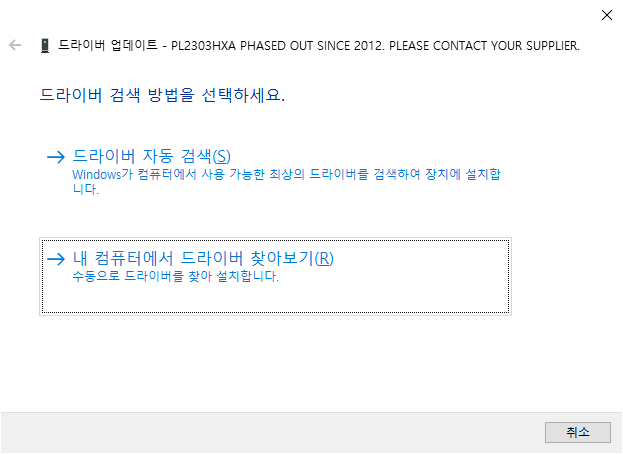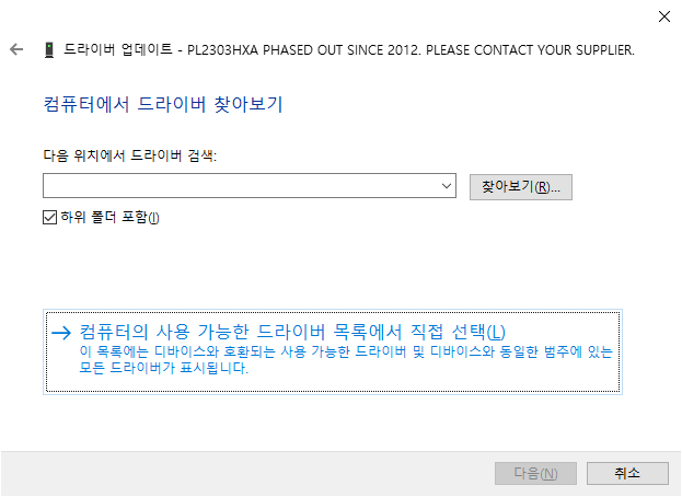 드라이버 업데이트 드라이버는 앞서 설치했으므로 내 컴퓨터에서 드라이버 찾아보기를 클릭했다.