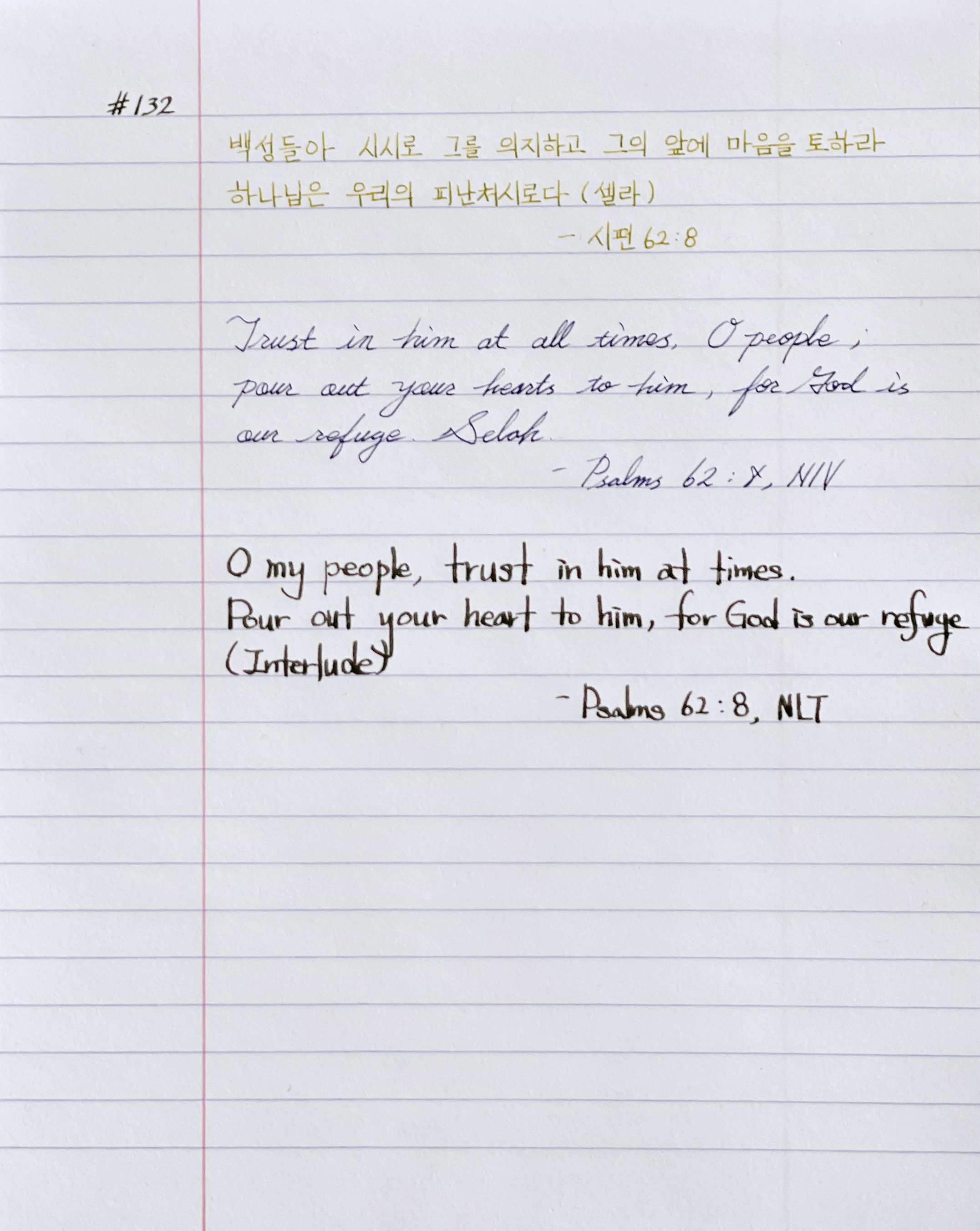백성들아 시시로 그를 의지하고 그의 앞에 마음을 토하라 하나님은 우리의 피난처시로다 (셀라)