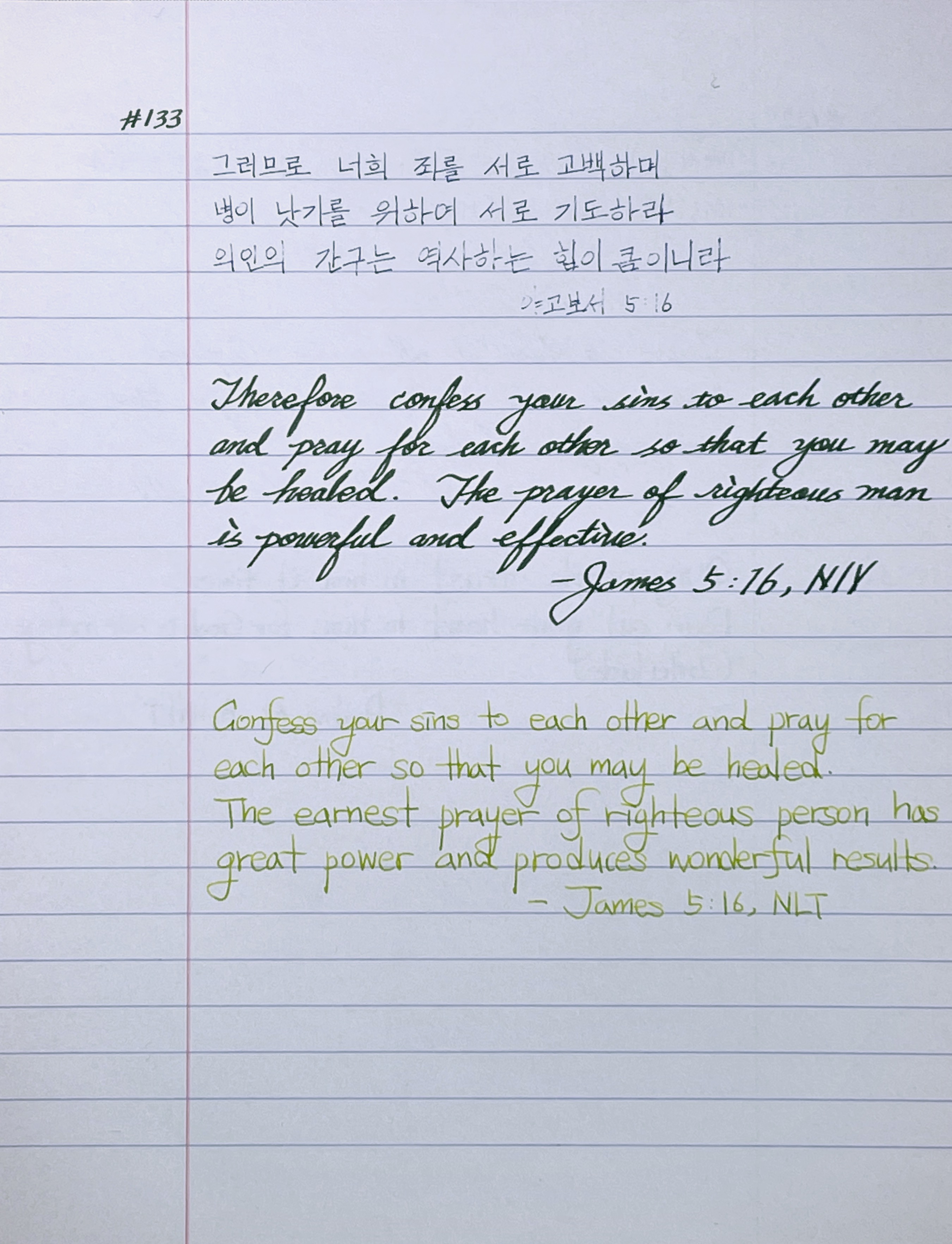 그러므로 너희 죄를 서로 고백하며 병이 낫기를 위하여 서로 기도하라 의인의 간구는 역사하는 힘이 큼이니라