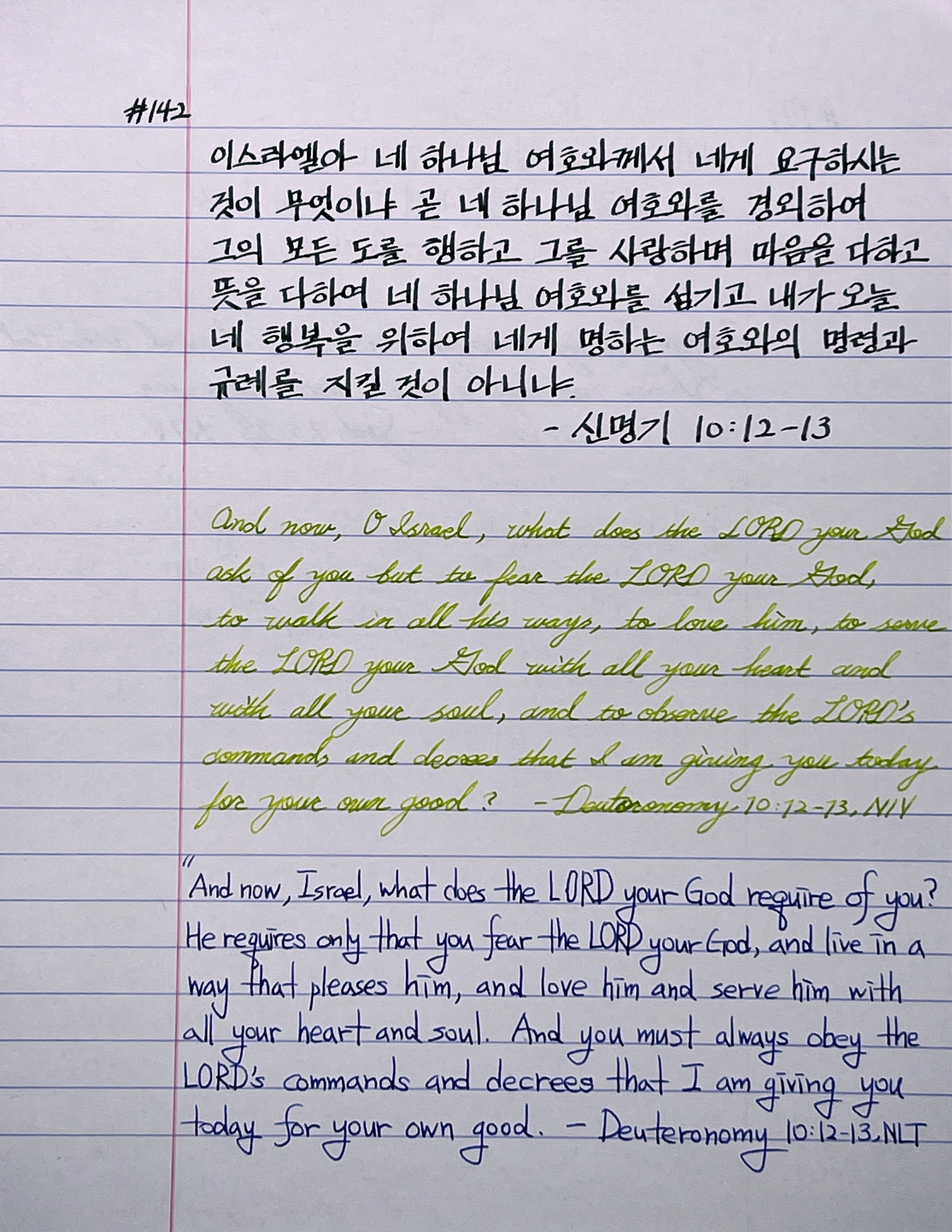 이스라엘아 네 하나님 여호와께서 네게 요구하시는 것이 무엇이냐 곧 네 하나님 여호와를 경외하여 그의 모든 도를 행하고 그를 사랑하며 마음을 다하고 뜻을 다하여 네 하나님 여호와를 섬기고 내가 오늘 네 행복을 위하여 네게 명하는 여호와의 명령과 규례를 지킬 것이 아니냐