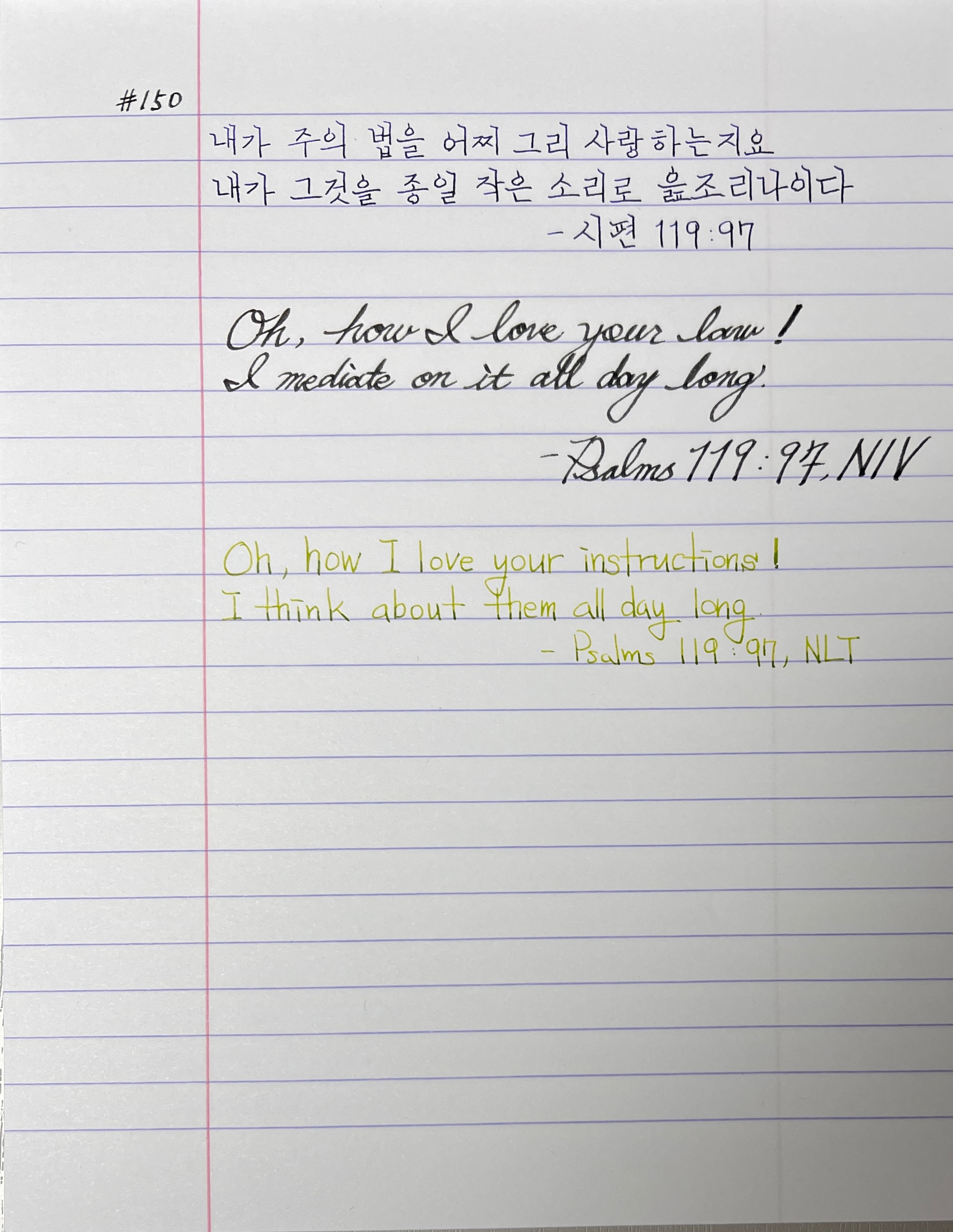 내가 주의 법을 어찌 그리 사랑하는지요 내가 그것을 종일 작은 소리로 읊조리나이다