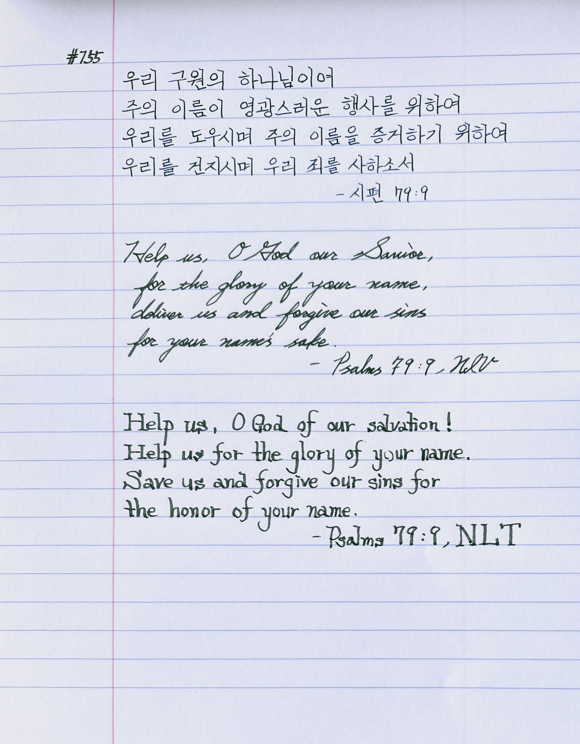 우리 구원의 하나님이여 주의 이름의 영광스러운 행사를 위하여 우리를 도우시며 주의 이름을 증거하기 위하여 우리를 건지시며 우리 죄를 사하소서