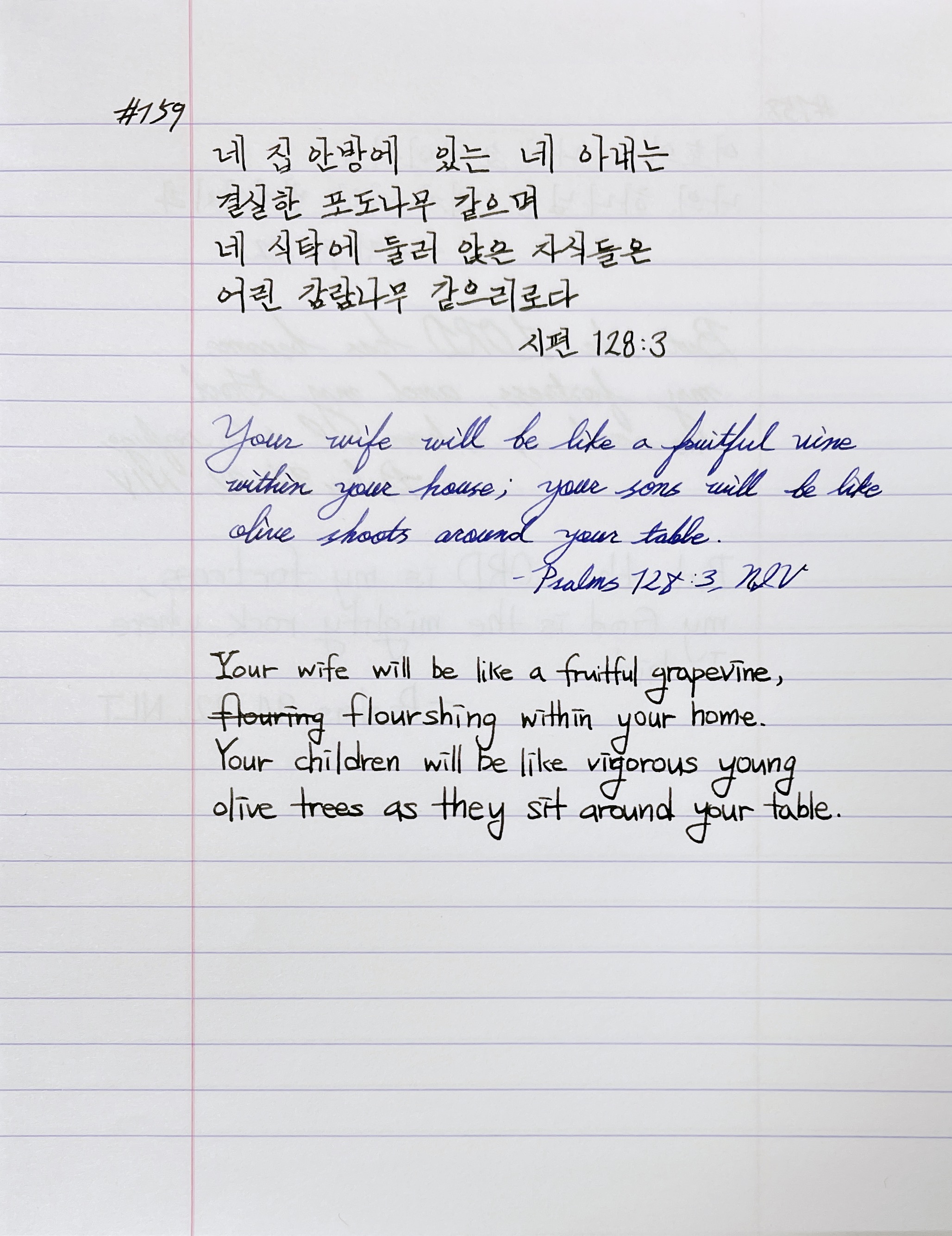 네 집 안방에 있는 네 아내는 결실한 포도나무 같으며 네 식탁에 둘러 앉은 자식들은 어린 감람나무 같으리로다