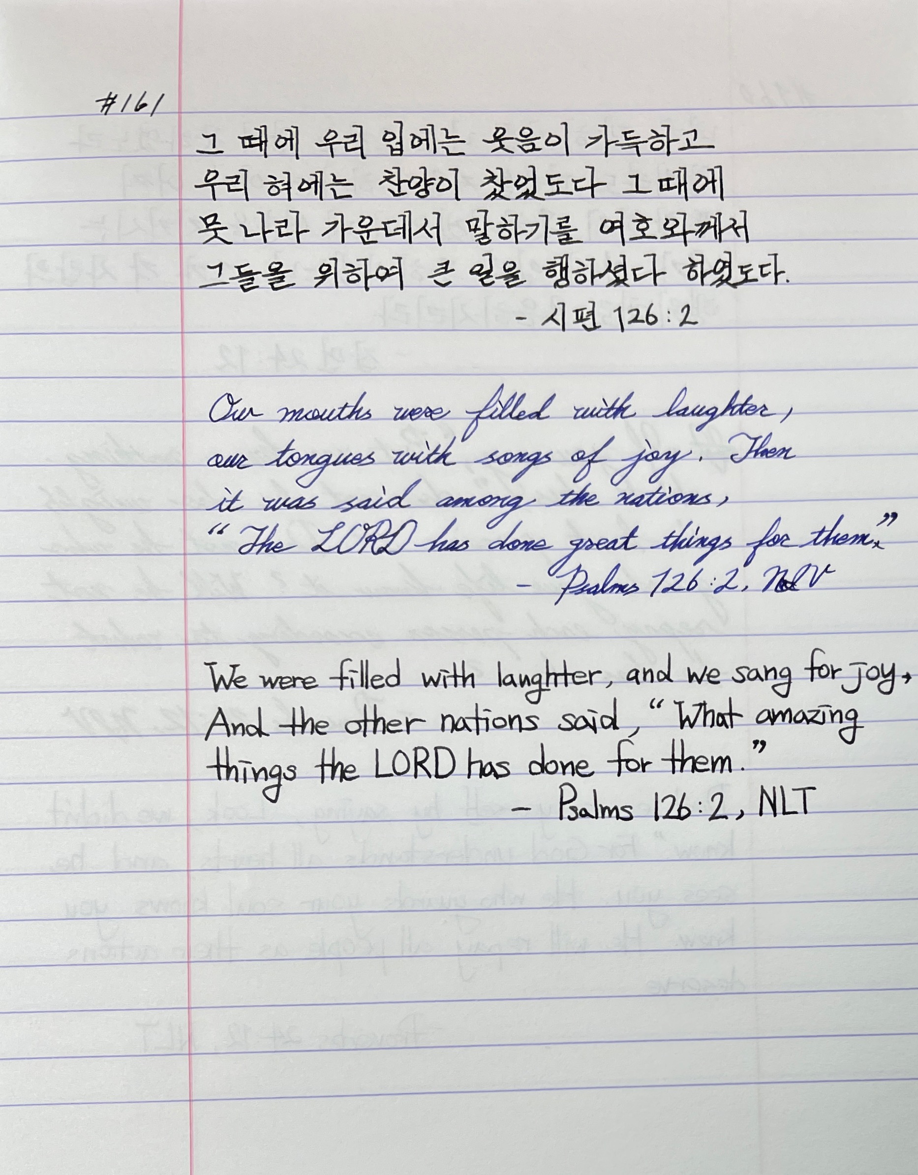 그 때에 우리 입에는 웃음이 가득하고 우리 혀에는 찬양이 찼었도다 그 때에 뭇 나라 가운데에서 말하기를 여호와께서 그들을 위하여 큰 일을 행하셨다 하였도다