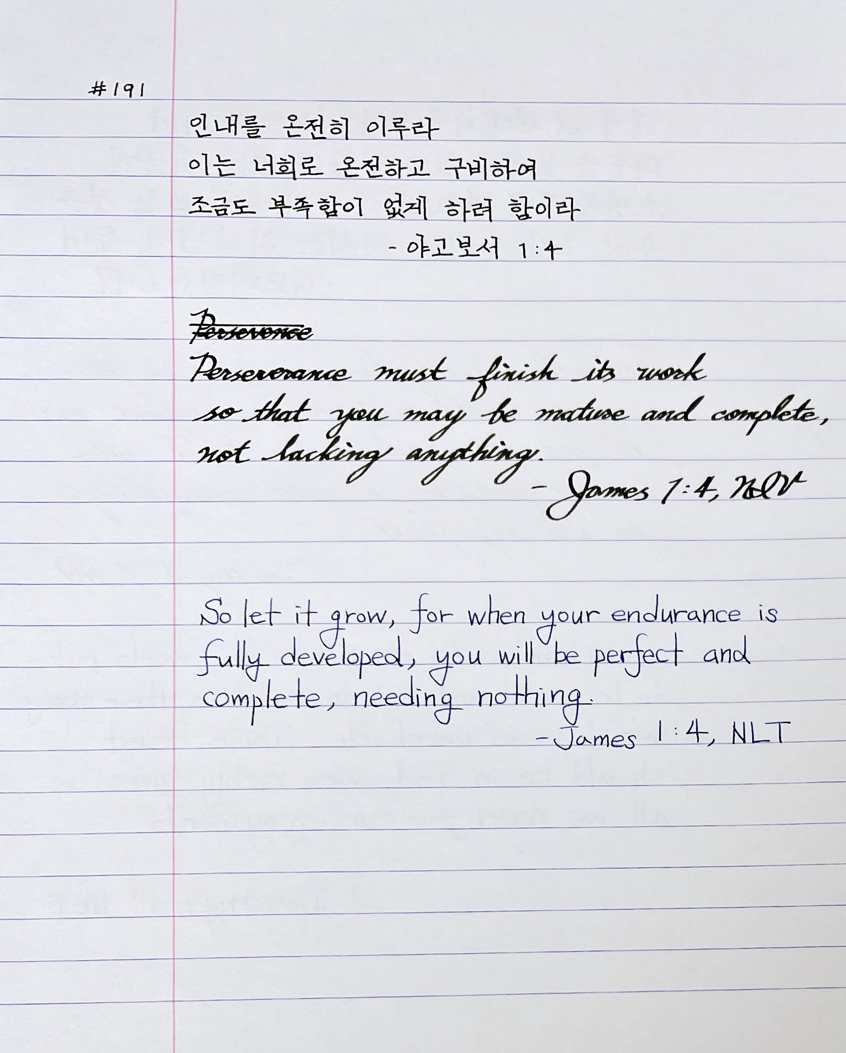인내를 온전히 이루라 이는 너희로 온전하고 구비하여 조금도 부족함이 없게 하려 함이라
