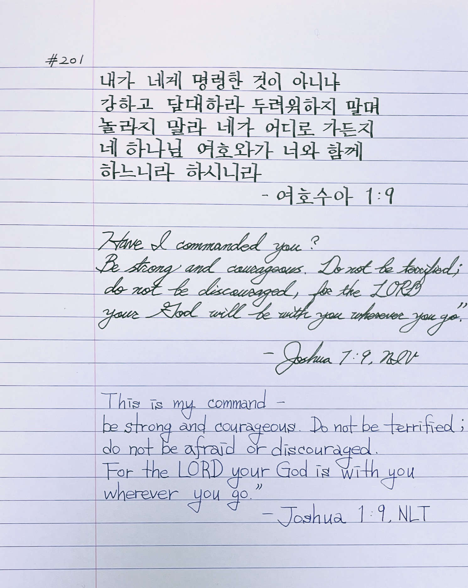 내가 네게 명령한 것이 아니냐 강하고 담대하라 두려워하지 말며 놀라지 말라 네가 어디로 가든지 네 하나님 여호와가 너와 함께 하느니라 하시니라