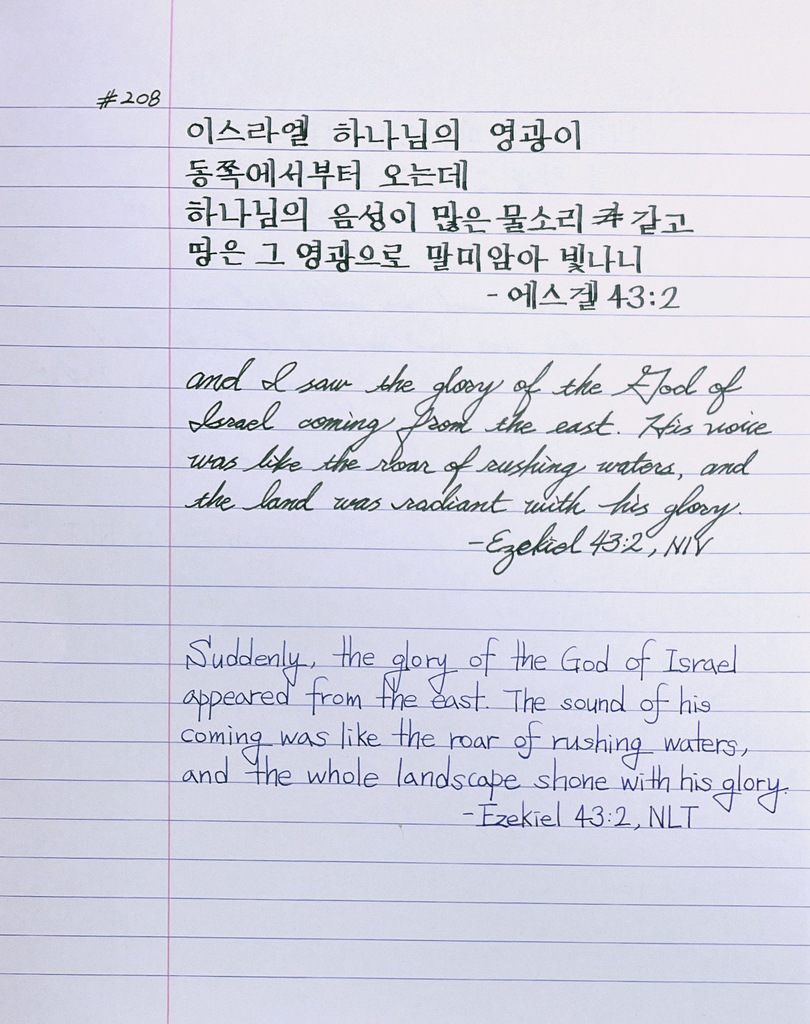 이스라엘 하나님의 영광이 동쪽에서부터 오는데 하나님의 음성이 많은 물 소리 같고 땅은 그 영광으로 말미암아 빛나니 _겔43:2