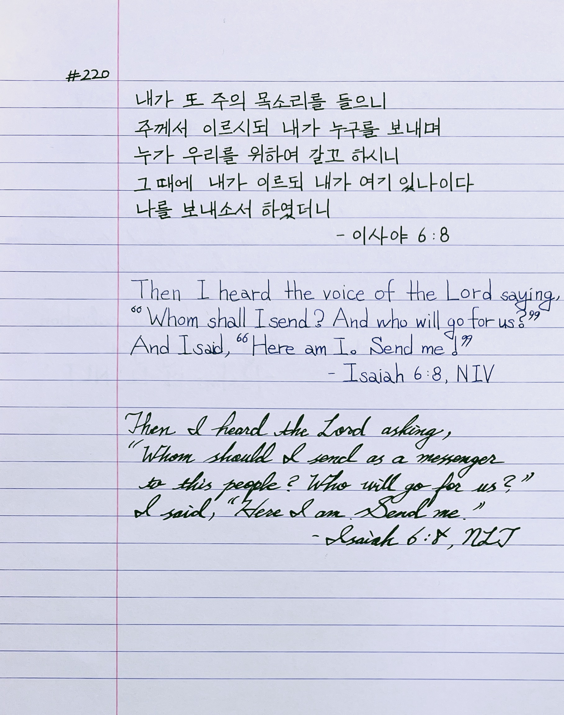 내가 또 주의 목소리를 들으니 주께서 이르시되 내가 누구를 보내며 누가 우리를 위하여 갈꼬 하시니 그 때에 내가 이르되 내가 여기 있나이다 나를 보내소서 하였더니 _사6:8