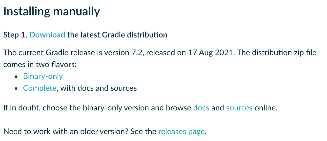 하지만 이걸 원한것은 아니었고 매뉴얼 설치에 대한 부분을 더 살펴 보면 Gradle 배포 판을 다운로드 받아 사용할 수 있다고 나온다.