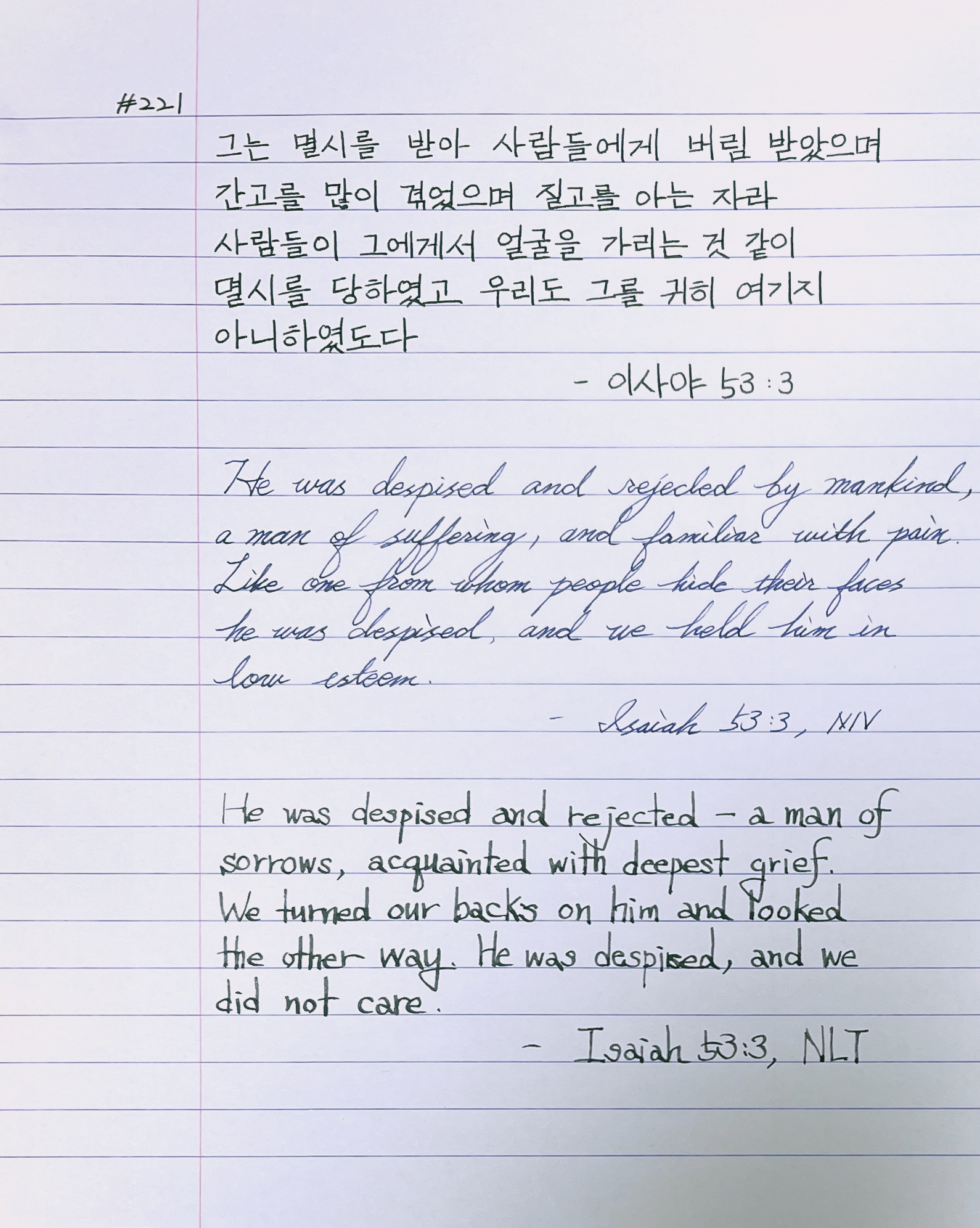 그는 멸시를 받아 사람들에게 버림 받았으며 간고를 많이 겪었으며 질고를 아는 자라 마치 사람들이 그에게서 얼굴을 가리는 것 같이 멸시를 당하였고 우리도 그를 귀히 여기지 아니하였도다 _사53:3