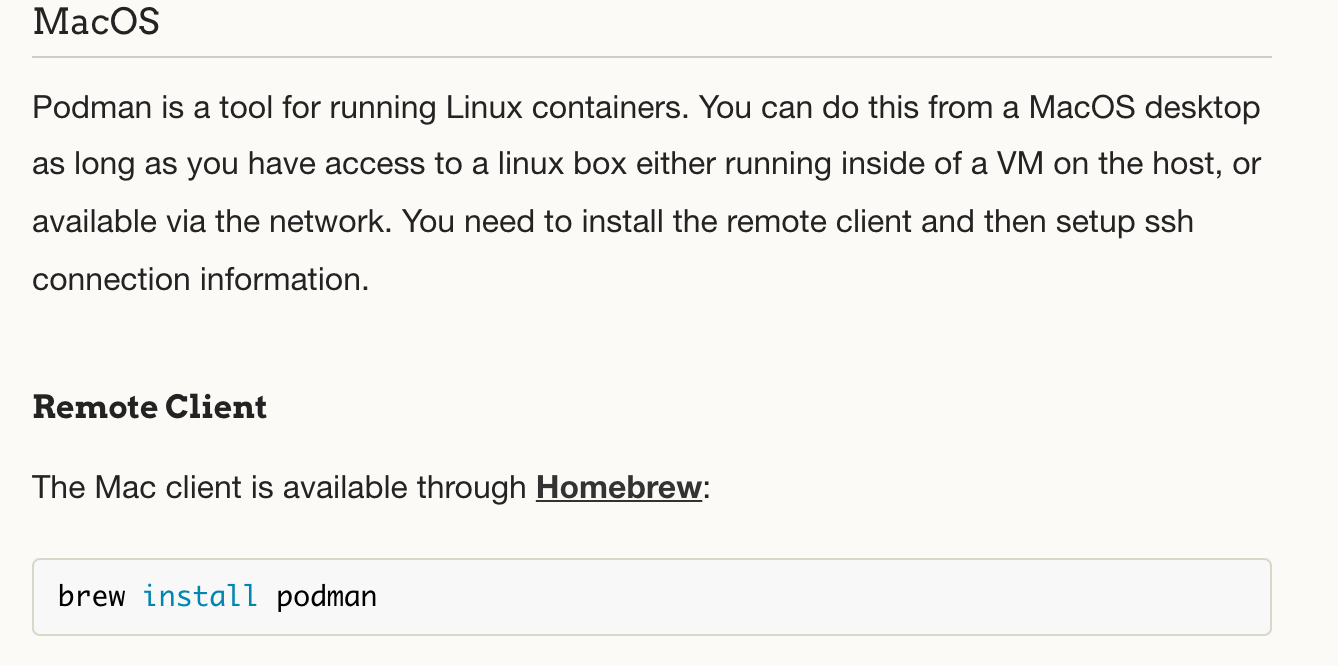지난 글에서 잠깐 이야기했는데 podman은 Linux 용 프로그램이며 이를 위해서는 Linux Server가 필요하다. MacOS의 경우는 Linux가 아니므로 제공되는 Podman은 Remote Client 기능만 포함된다.