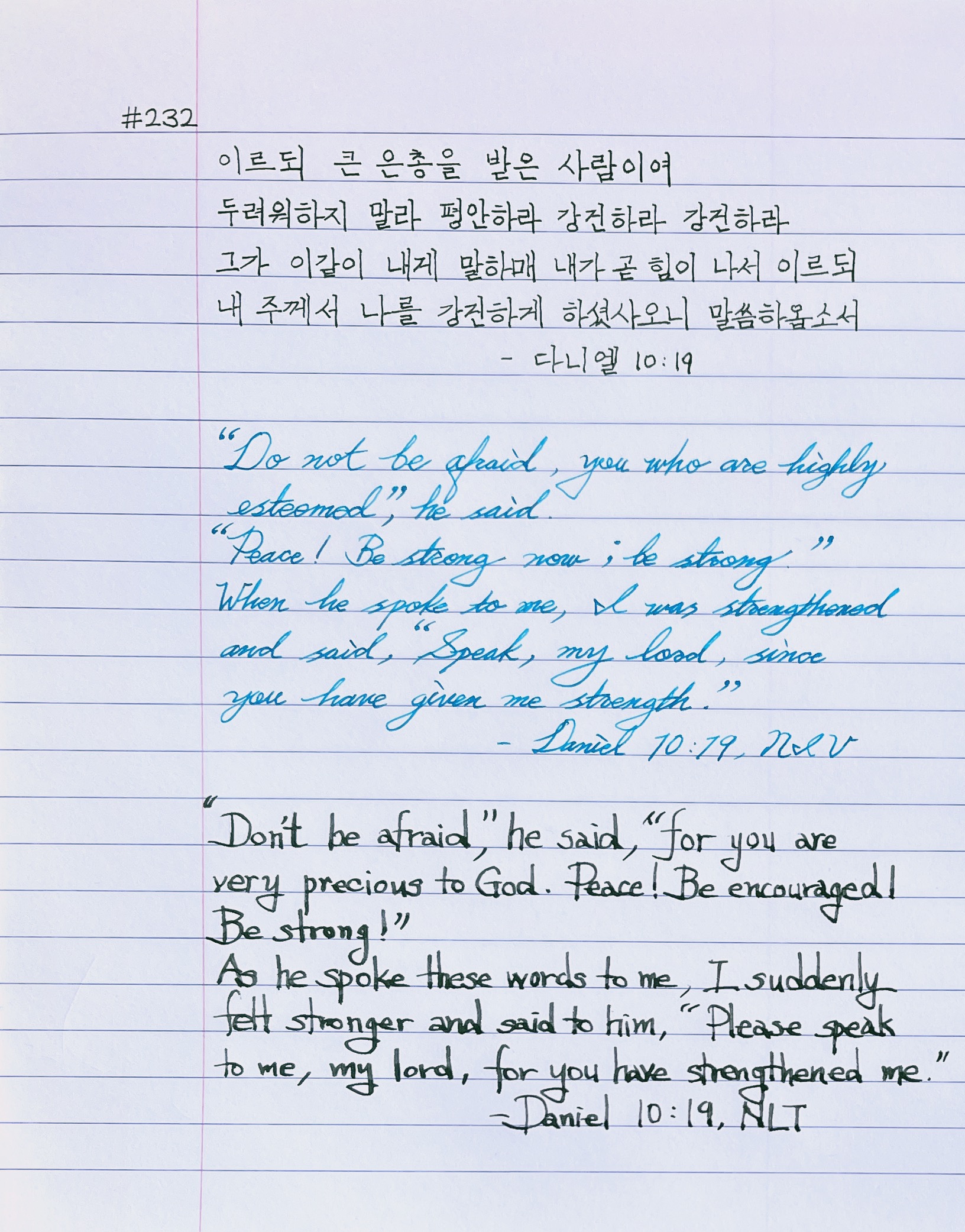 이르되 큰 은총을 받은 사람이여 두려워하지 말라 평안하라 강건하라 강건하라 그가 이같이 내게 말하매 내가 곧 힘이 나서 이르되 내 주께서 나를 강건하게 하셨사오니 말씀하옵소서 _단10:19