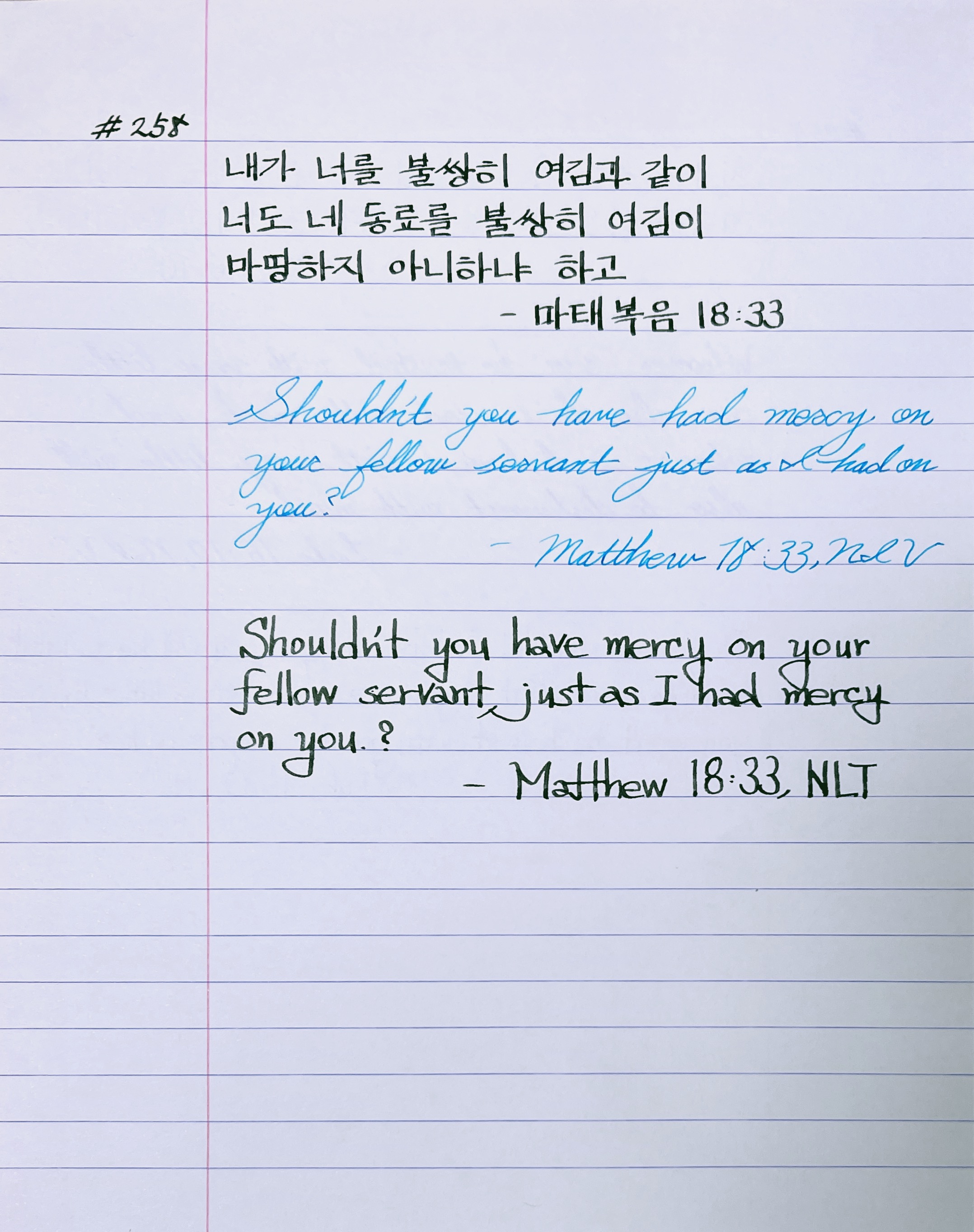 내가 너를 불쌍히 여김과 같이 너도 네 동료를 불쌍히 여김이 마땅하지 아니하냐 하고 _마18:33