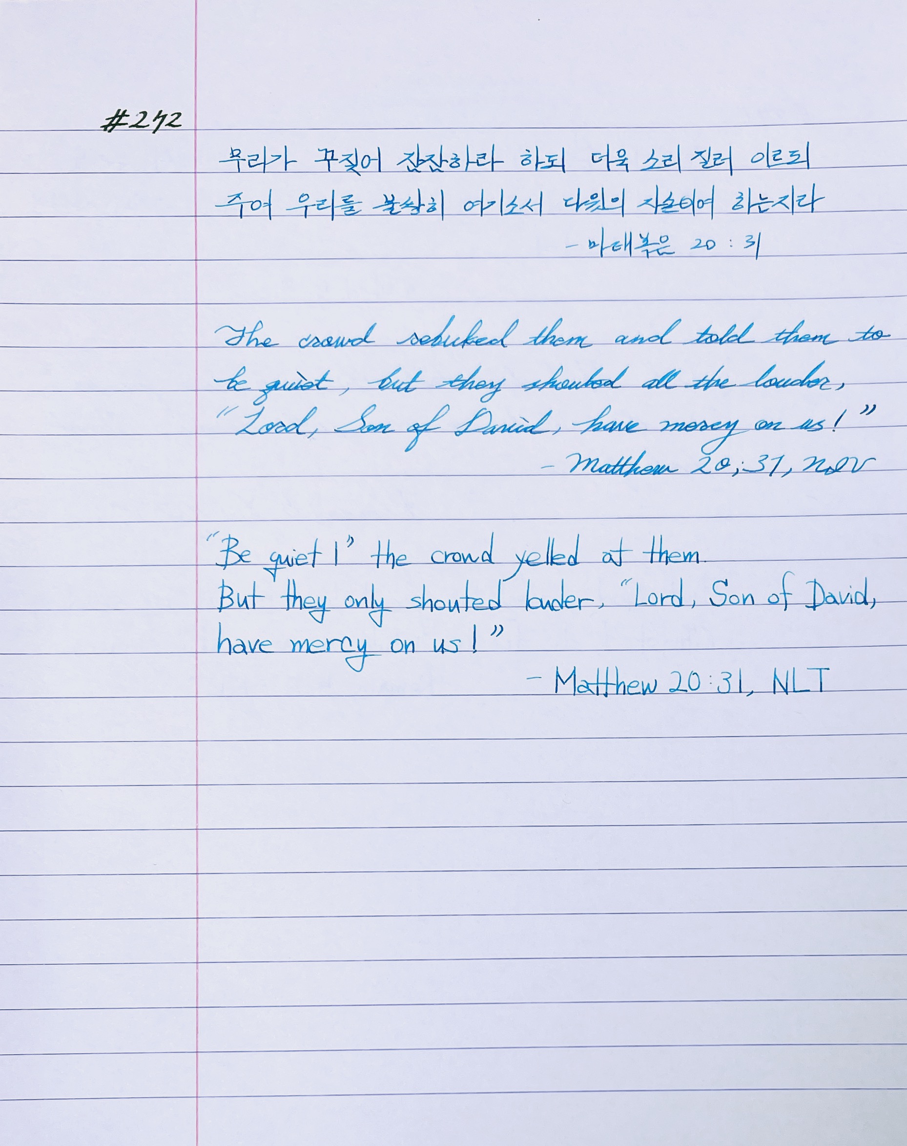 무리가 꾸짖어 잠잠하라 하되 더욱 소리 질러 이르되 주여 우리를 불쌍히 여기소서 다윗의 자손이여 하는지라 _마20:31