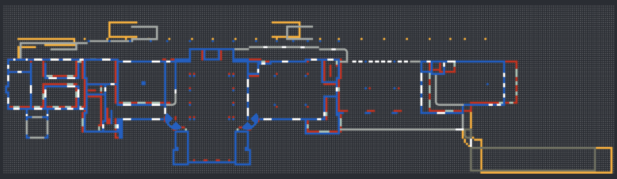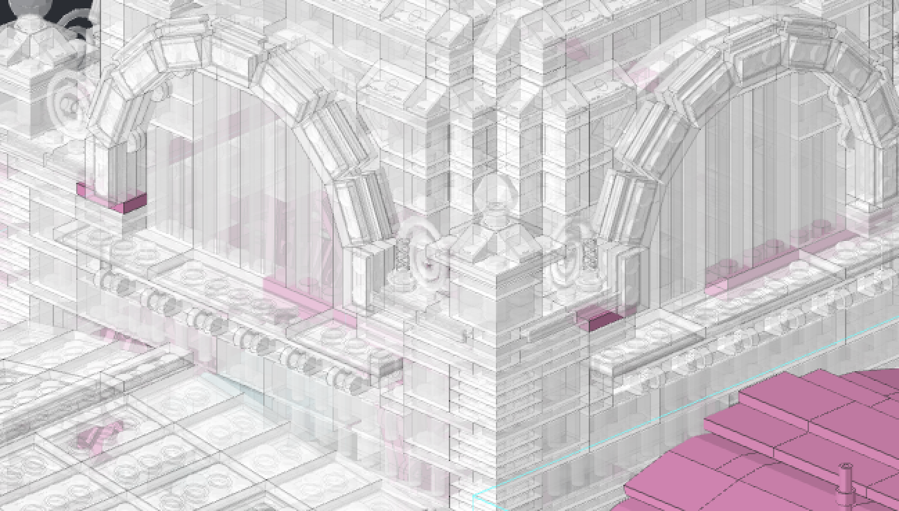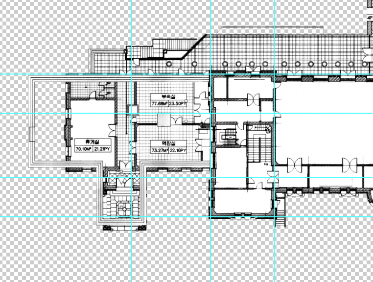좌측, 우측면 비교 건물의 너비가 1 브릭정도 차이가 나고 있었다. 아마도 도면의 수치를 보고 브릭으로 변환할 때 일정하게 단위 변환을 했다고 생각했는데 오차가 발생하는 부분이 부분 부분 마다 다르게 계산된 것 같다. 그래서 전반적으로 어떻게 되어 있는지를 다시 확인하기 위해 도면에 브릭 크기의 격자 무늬를 만들고 이를 기준으로 다시 기초 부분을 확인했다.