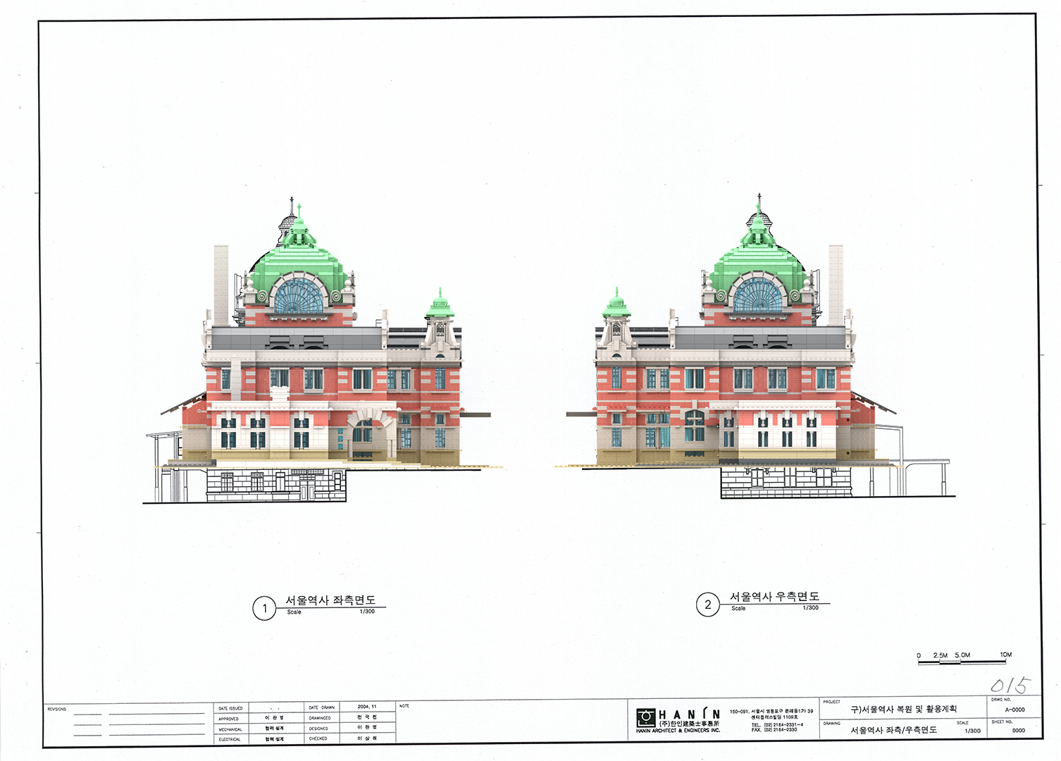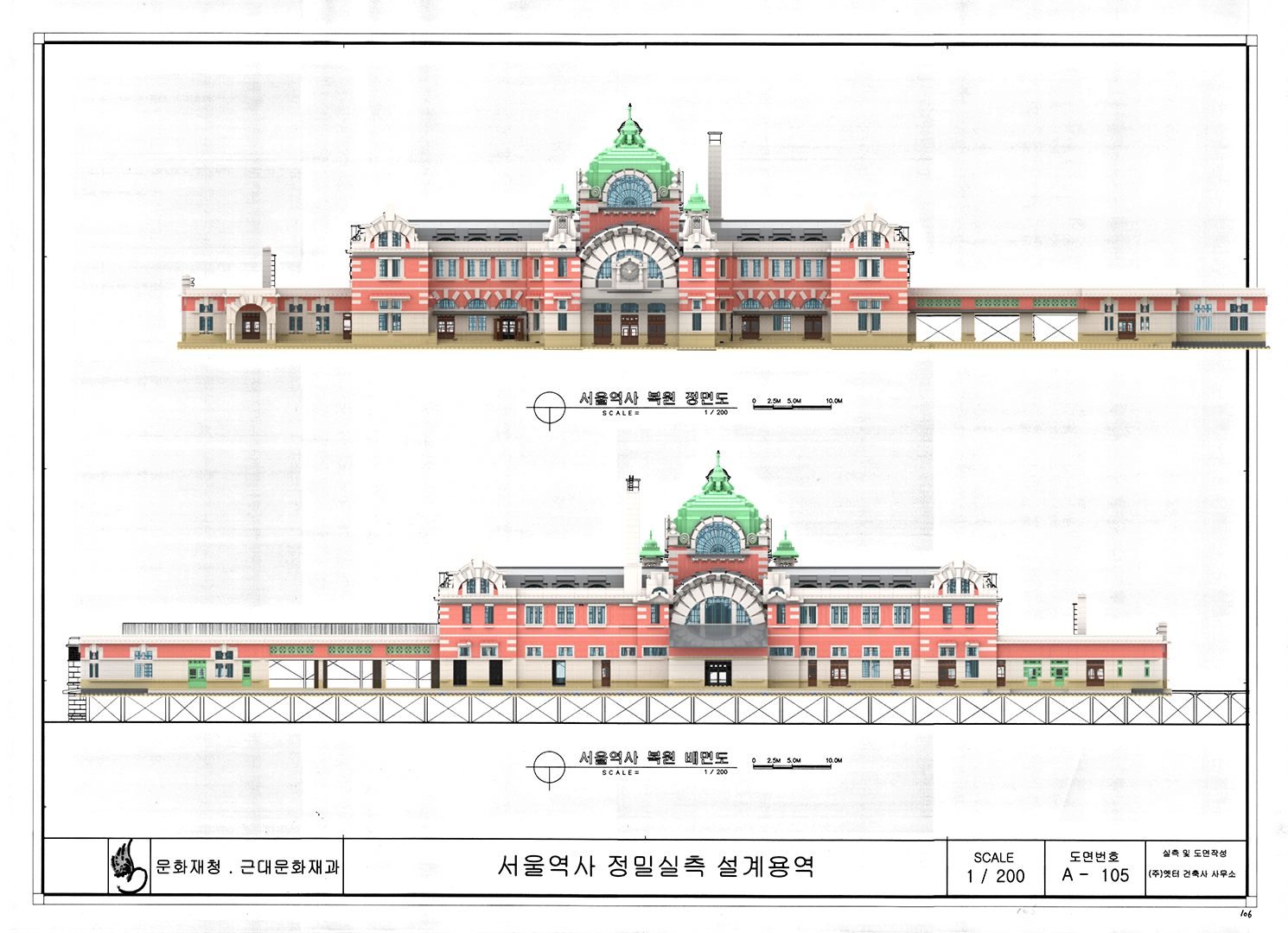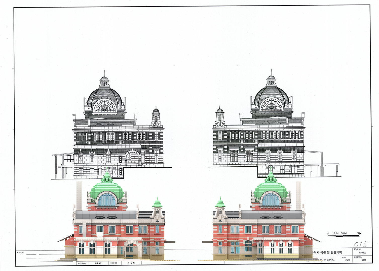 정면도, 후면도 비교 먼저 굴뚝의 높이가 차이가 나는 것과 오른쪽 수하물 취급소의 크기가 도면이 더 큰 것이 눈에 띄었다.