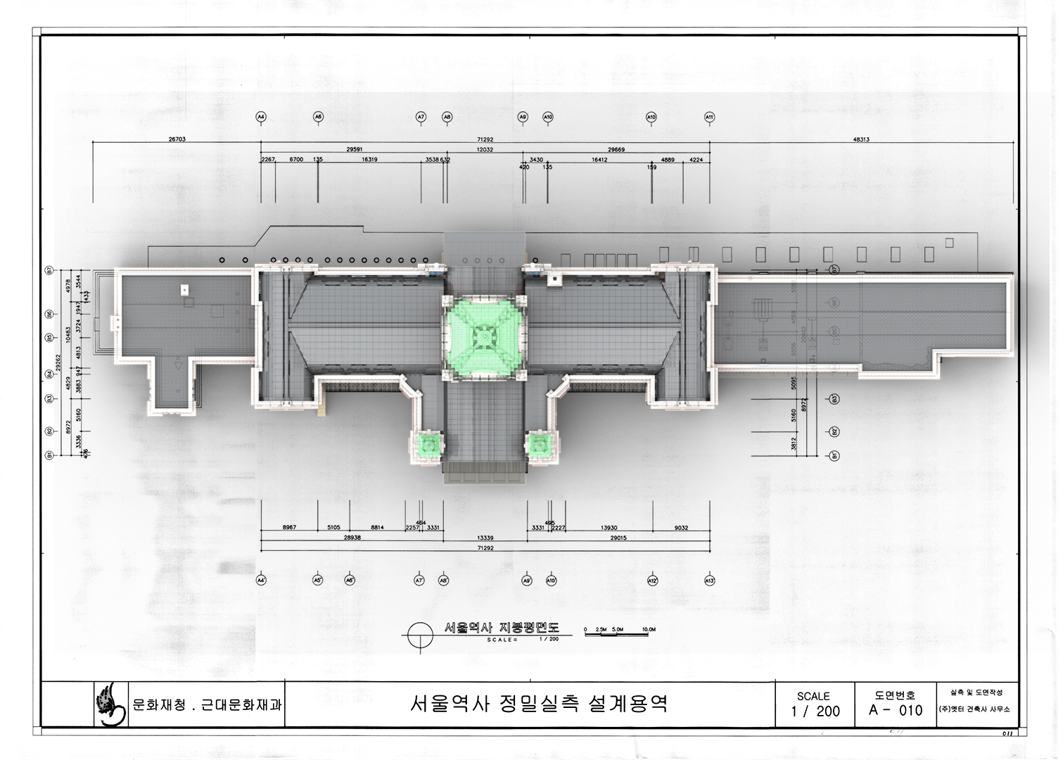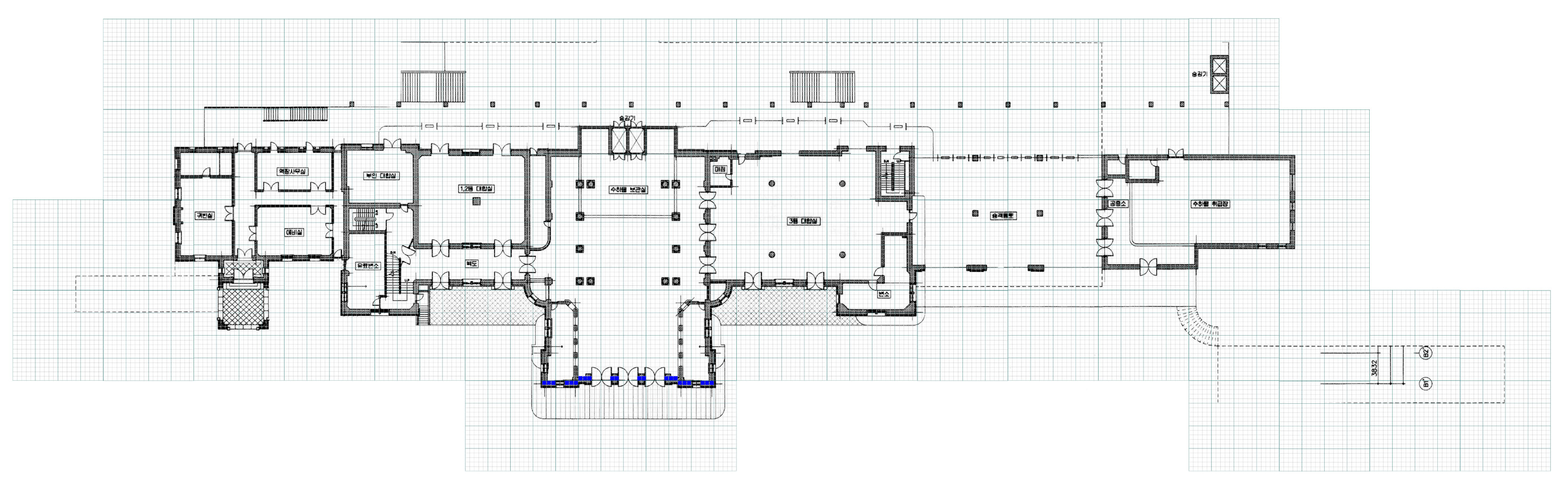 다음은 1층 도면에서 귀빈실의 그 크기는 20,851인데 (5419+5517+9915)인데 위의 지붕 평면도는 26,703로 꽤 큰 차이가 있다. 그래서, 1층과 2층 도면을 겹쳐보았는데 다른 곳은 오차를 감안해서 수긍이 가지만 귀빈실은 아무래도 도면 제작이 잘못된게 아닐까 싶다.