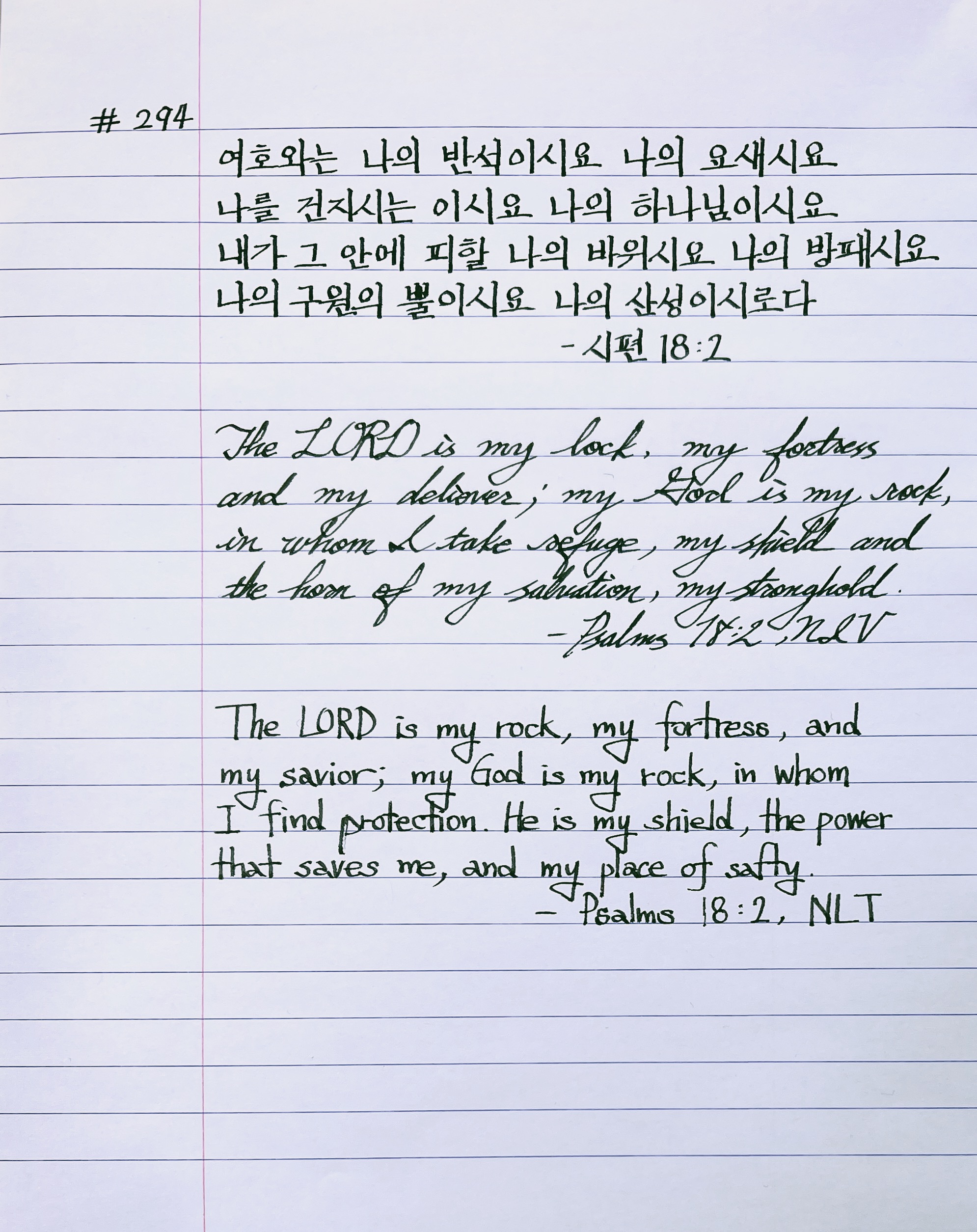 여호와는 나의 반석이시요 나의 요새시요 나를 건지시는 이시요 나의 하나님이시요 내가 그 안에 피할 나의 바위시요 나의 방패시요 나의 구원의 뿔이시요 나의 산성이시로다 _시18:2