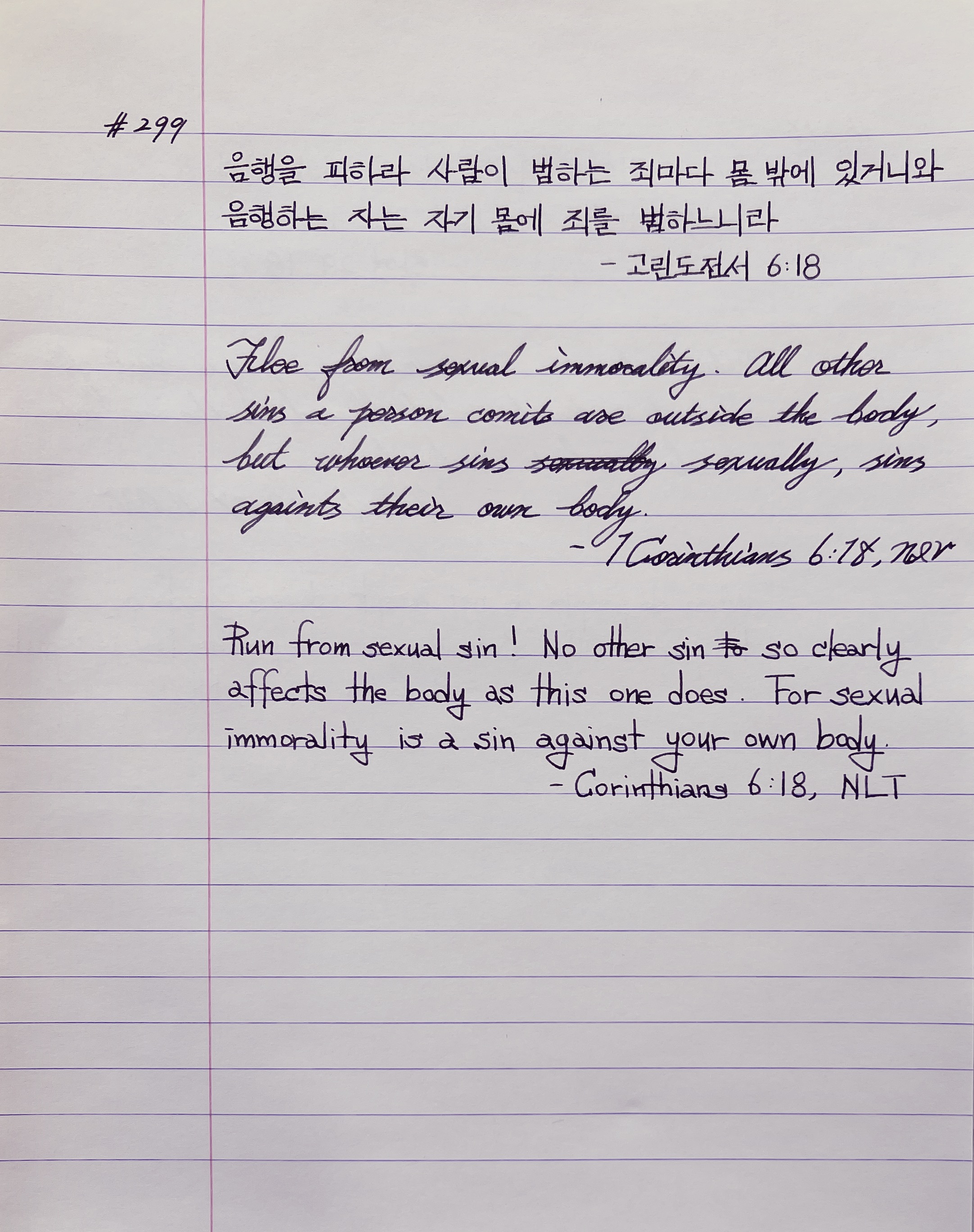 음행을 피하라 사람이 범하는 죄마다 몸 밖에 있거니와 음행하는 자는 자기 몸에 죄를 범하느니라 _고전6:18