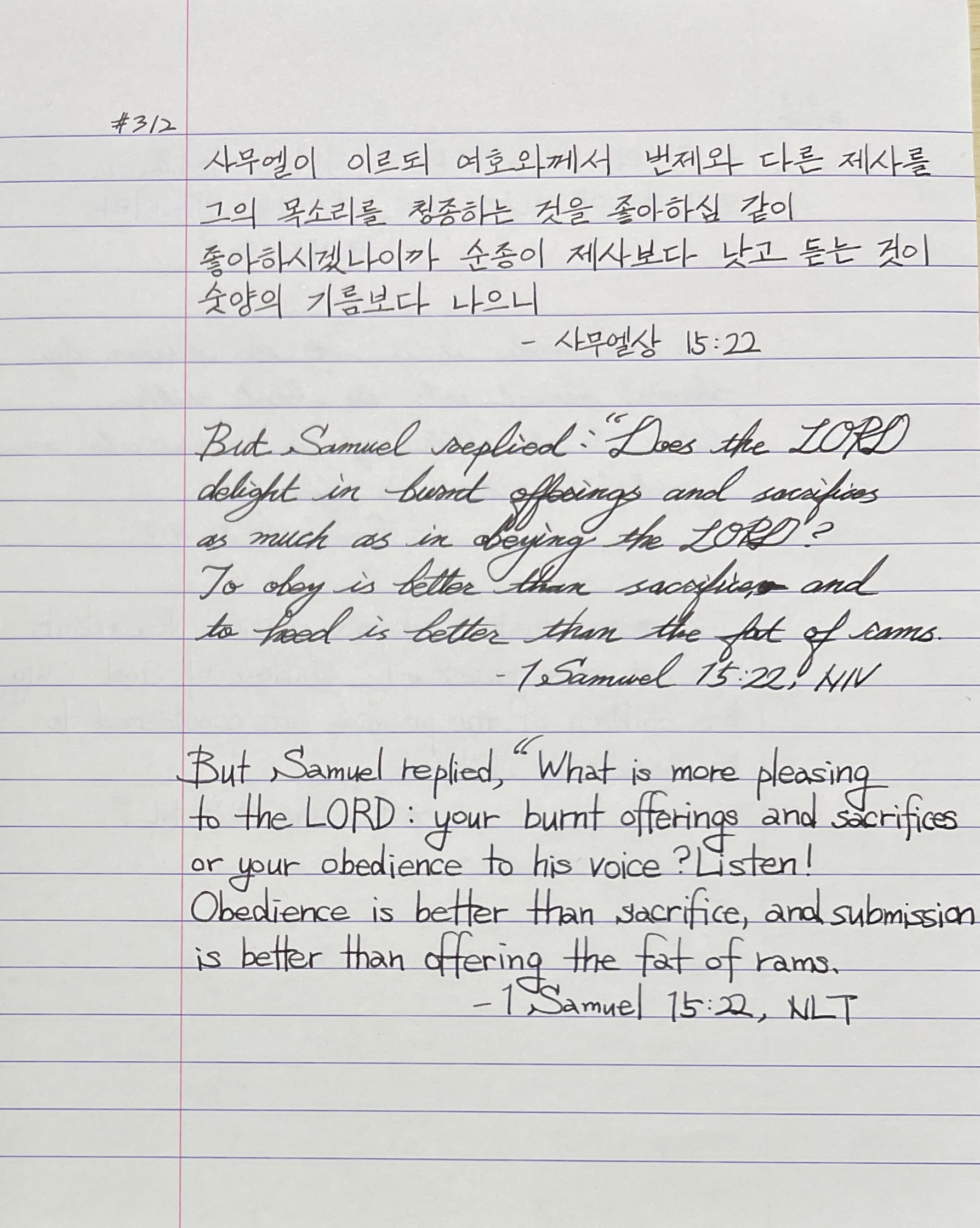 사무엘이 이르되 여호와께서 번제와 다른 제사를 그의 목소리를 청종하는 것을 좋아하심 같이 좋아하시겠나이까 순종이 제사보다 낫고 듣는 것이 숫양의 기름보다 나으니 _삼상15:22