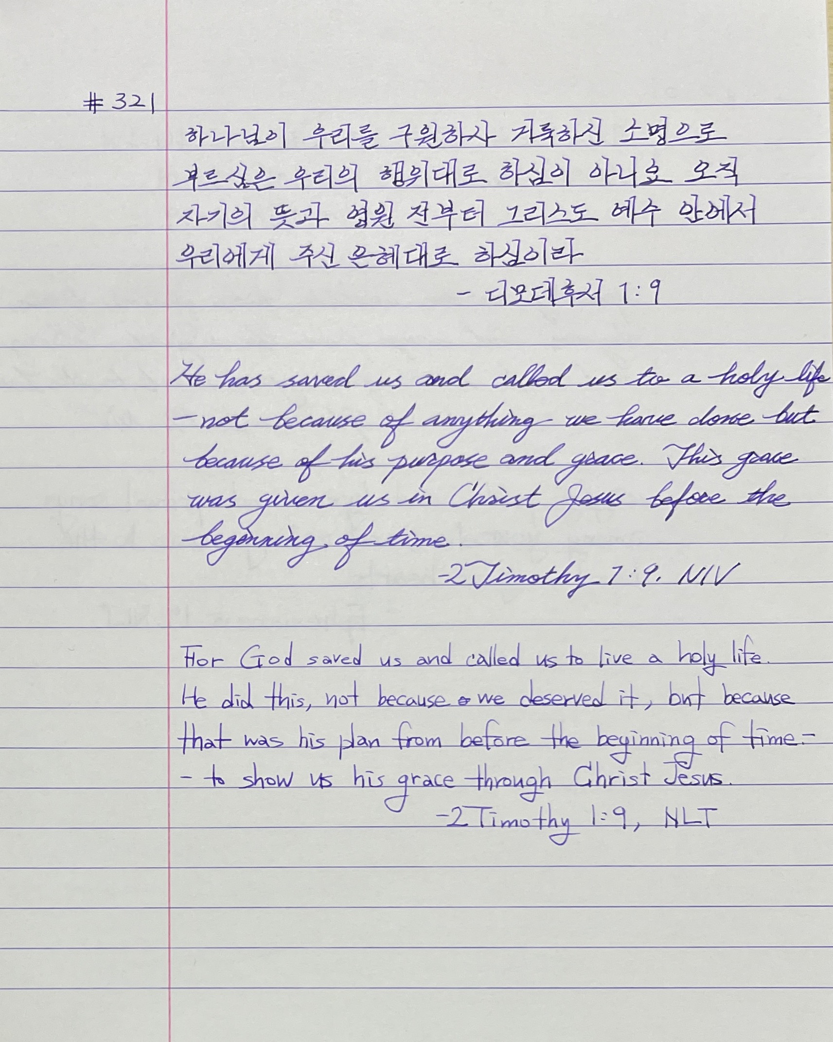 하나님이 우리를 구원하사 거룩하신 소명으로 부르심은 우리의 행위대로 하심이 아니요 오직 자기의 뜻과 영원 전부터 그리스도 예수 안에서 우리에게 주신 은혜대로 하심이라 _딤후1:9