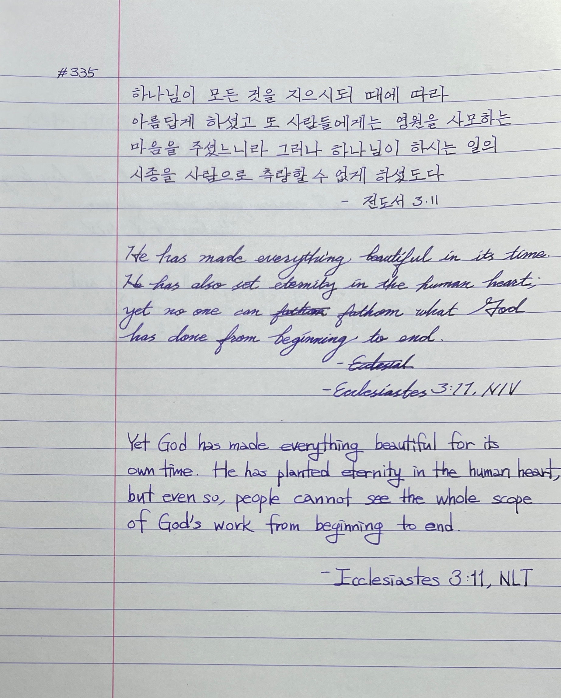 하나님이 모든 것을 지으시되 때를 따라 아름답게 하셨고 또 사람들에게는 영원을 사모하는 마음을 주셨느니라 그러나 하나님이 하시는 일의 시종을 사람으로 측량할 수 없게 하셨도다 _전3:11