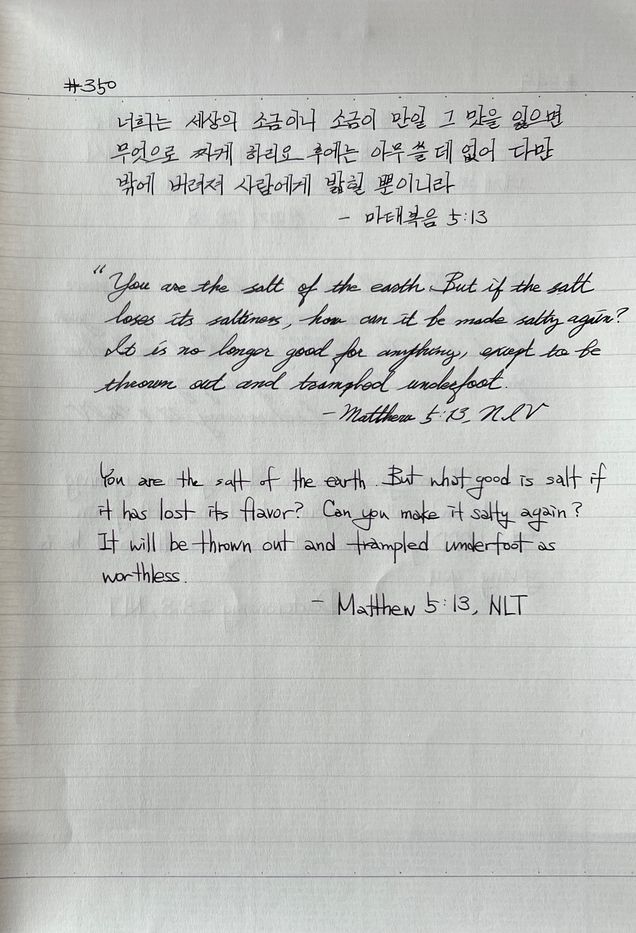 너희는 세상의 소금이니 소금이 만일 그 맛을 잃으면 무엇으로 짜게 하리요 후에는 아무 쓸 데 없어 다만 밖에 버려져 사람에게 밟힐 뿐이니라 _마5:13