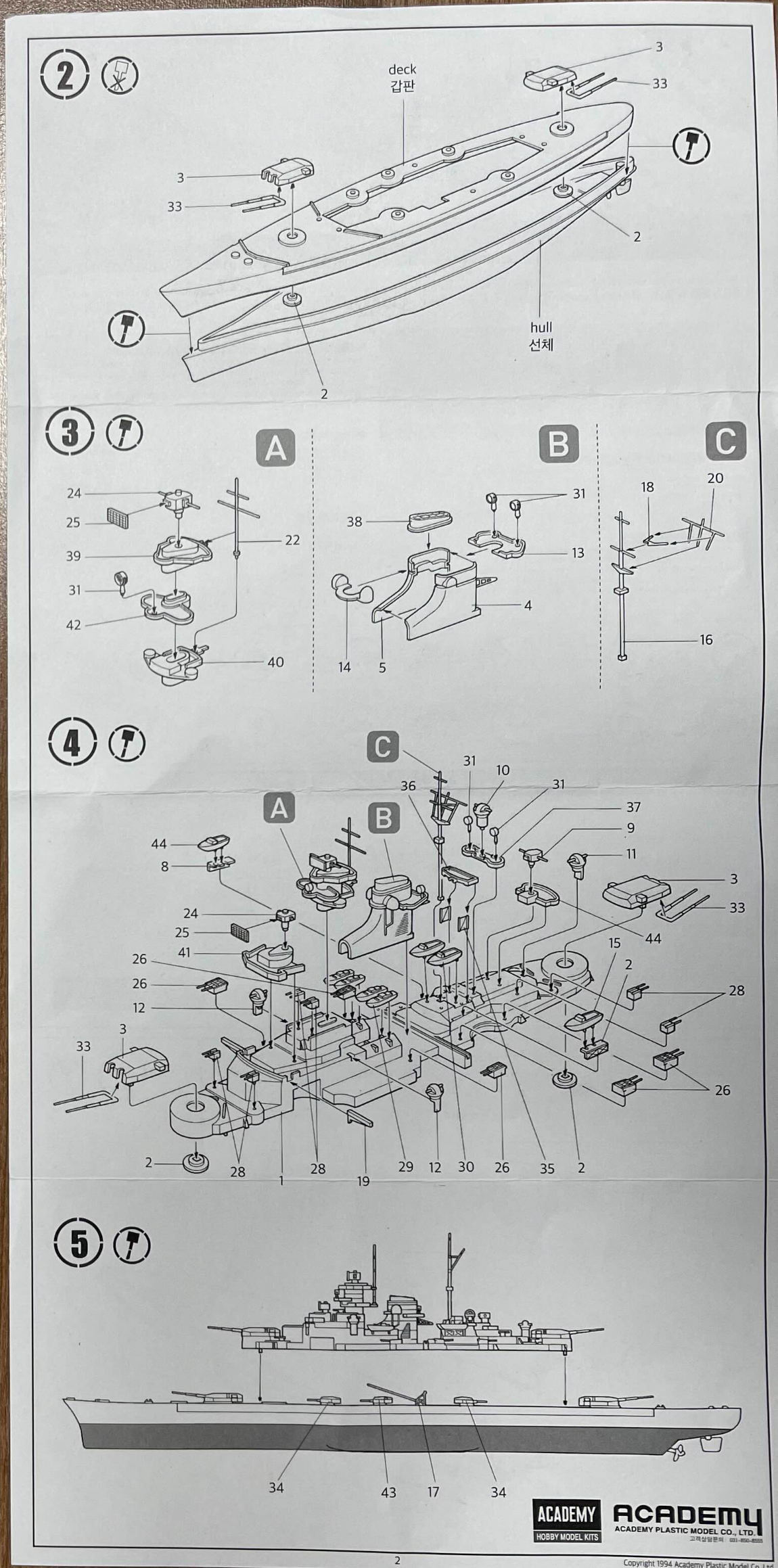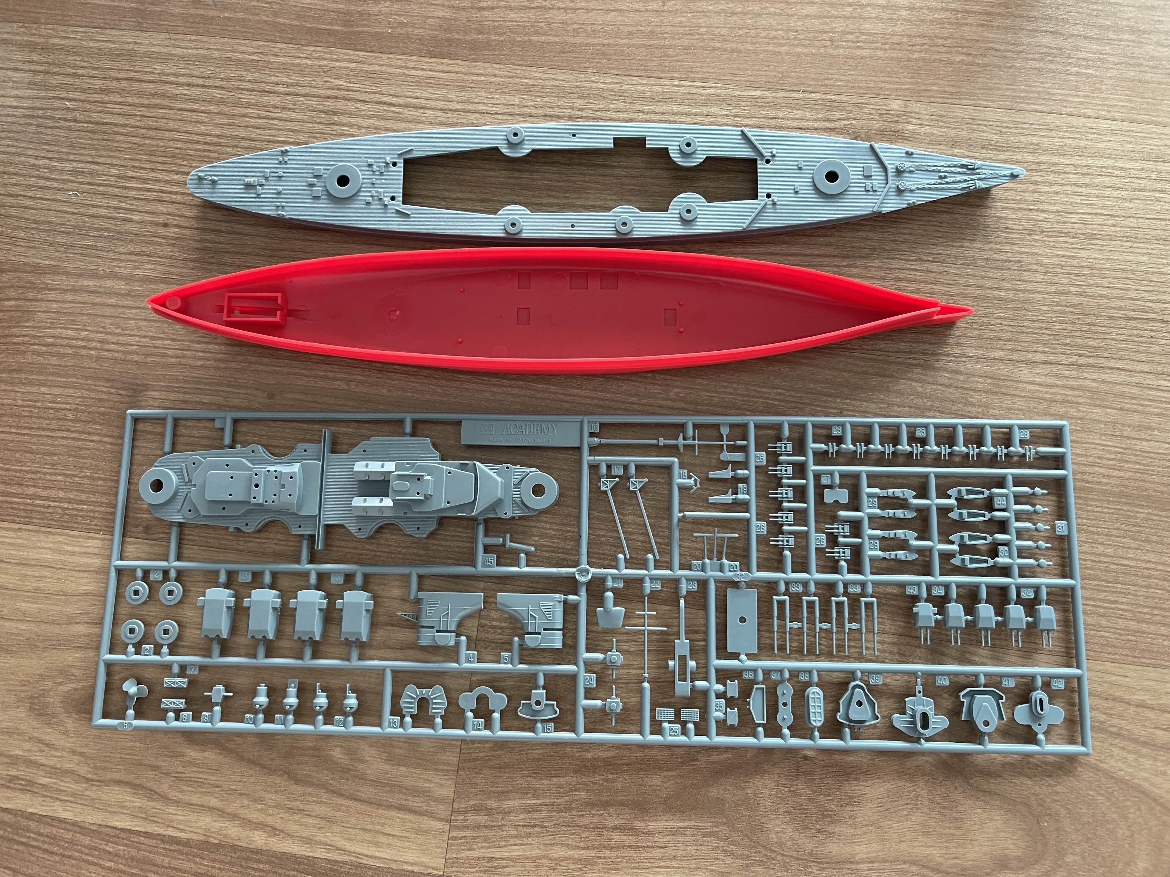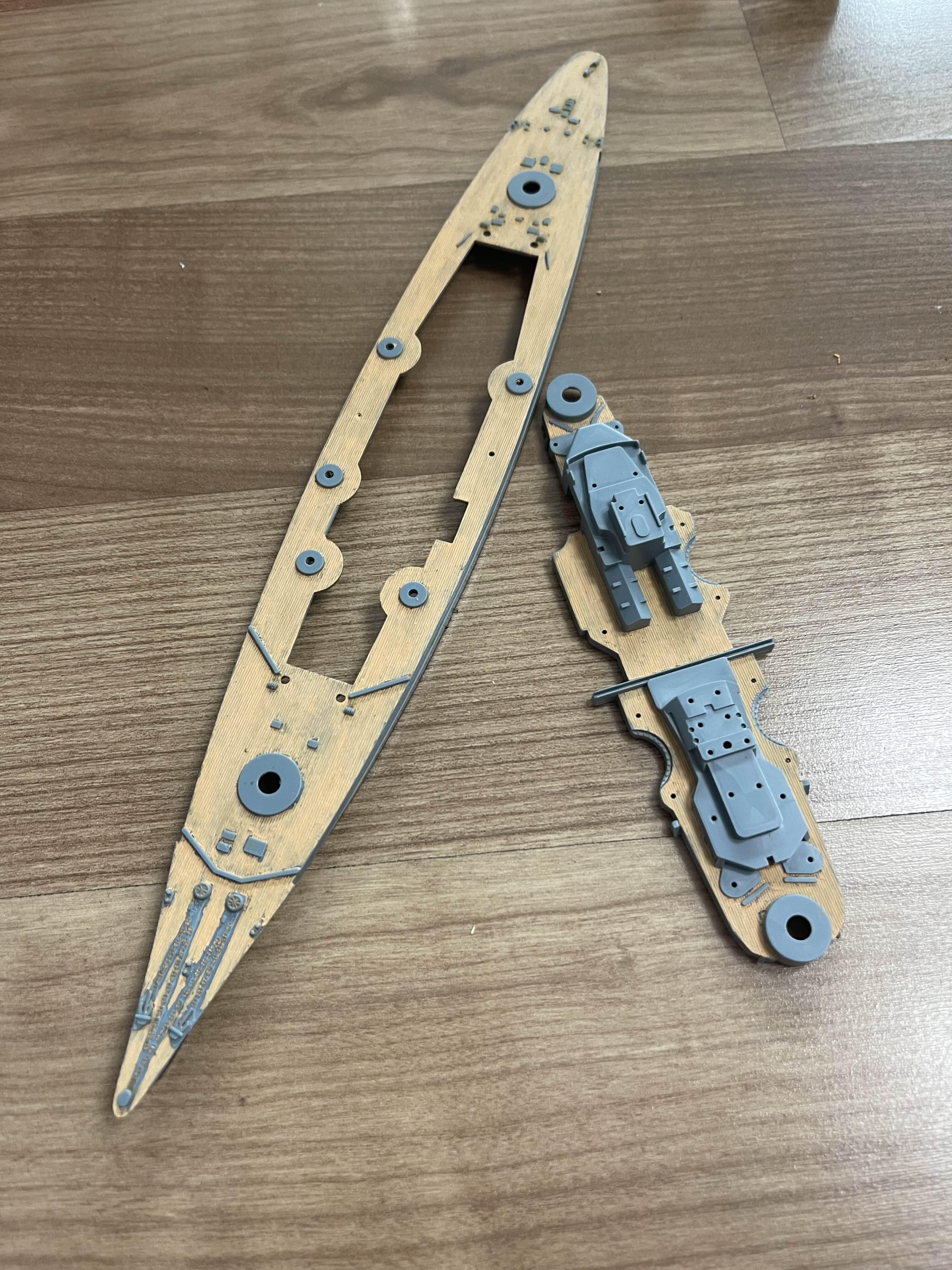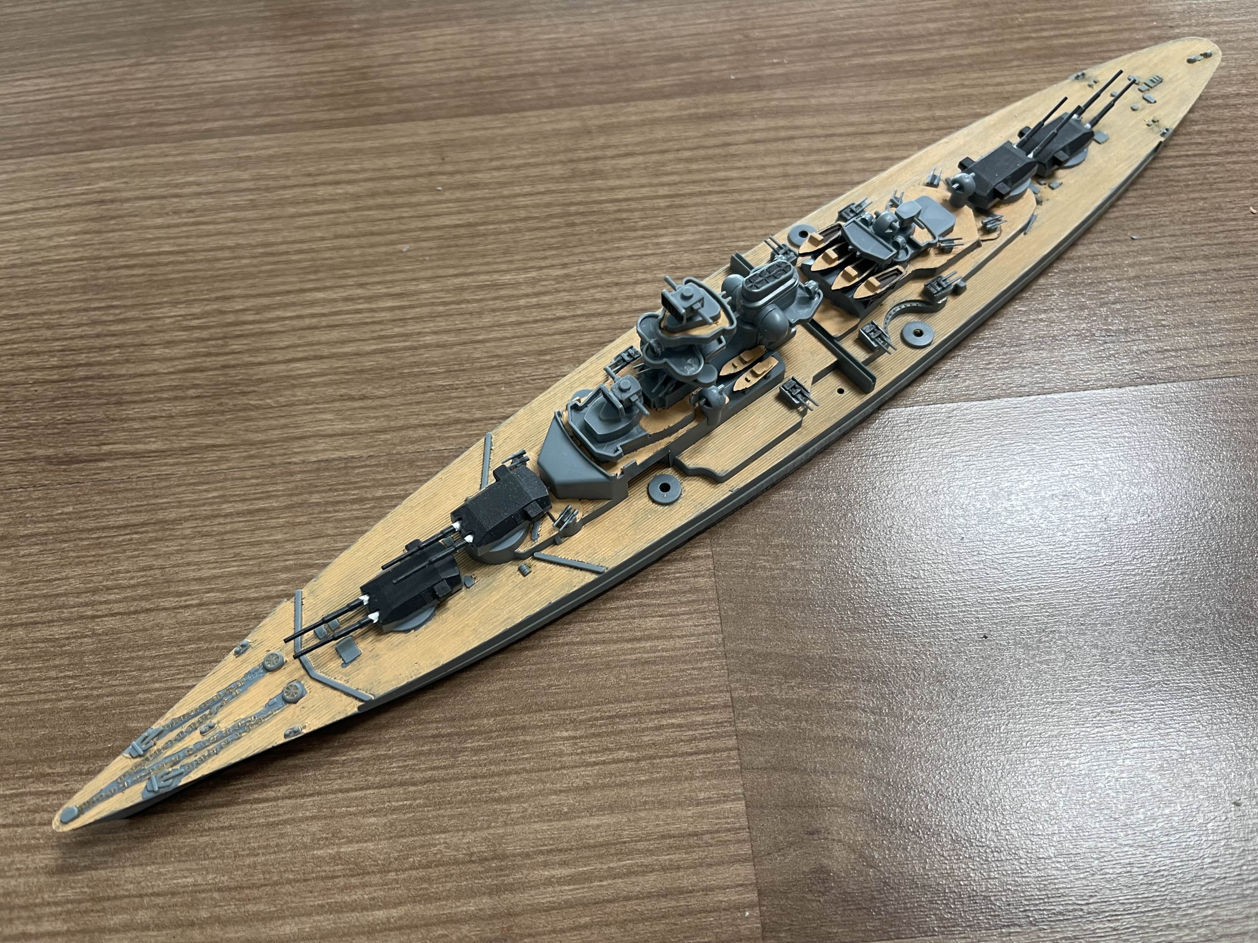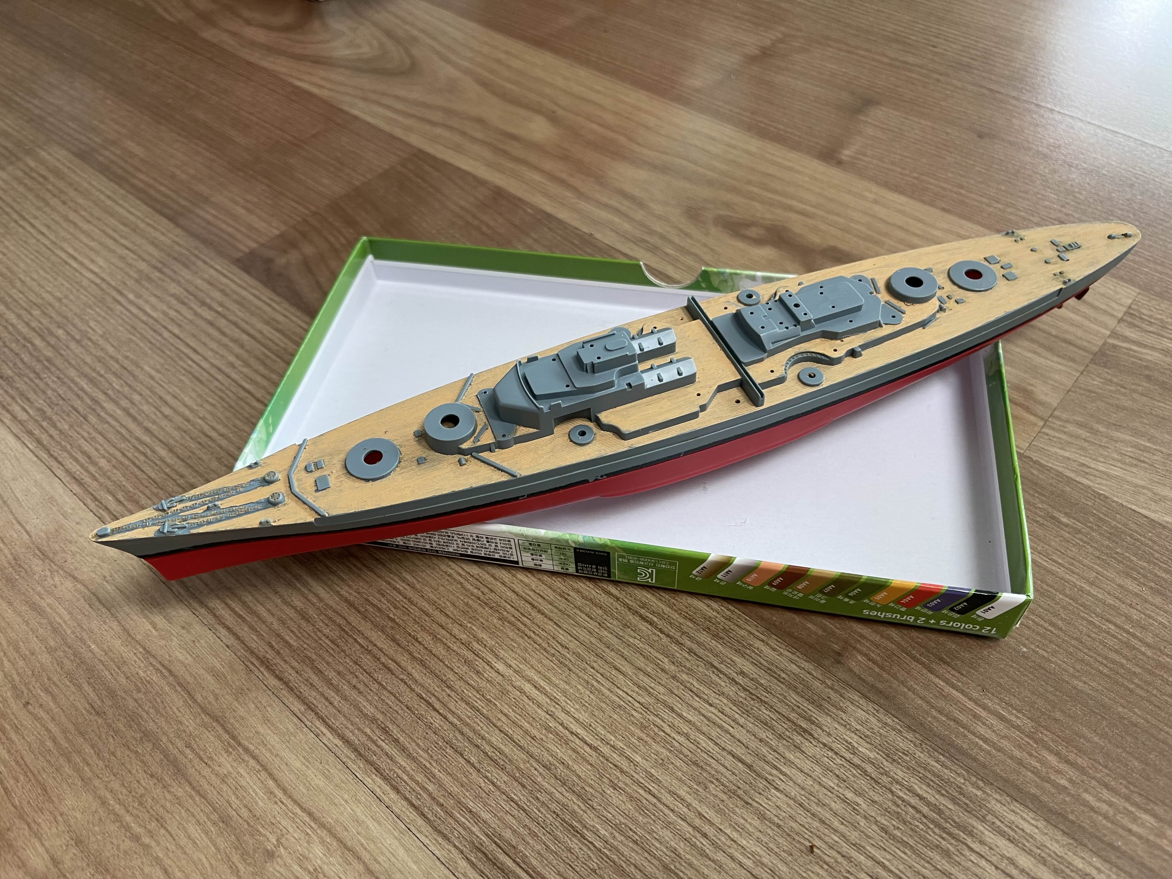 구성도 그리 복잡하지 않다 입체적인 전함을 도색하기에는 실력이 너무 없었고 그렇다고 안하기는 좀 아쉬운 마음이 들어 흘수선, 갑판, 함포 정도만 칠해 보기로 했다. 선체에 마스킹 테이브로 경계를 정하고 색을 입혔는데 마스킹 테이프 제거 시 도장이 같이 뜯겨져 나왔다. 오래 건조를 하지는 않았어도 어느정도는 마른 상태였는데 이런 일이! 게다가 마스킹 테이브면 관리를 잘못했는지 경계면도 지저분하게 허물어져 버렸다.