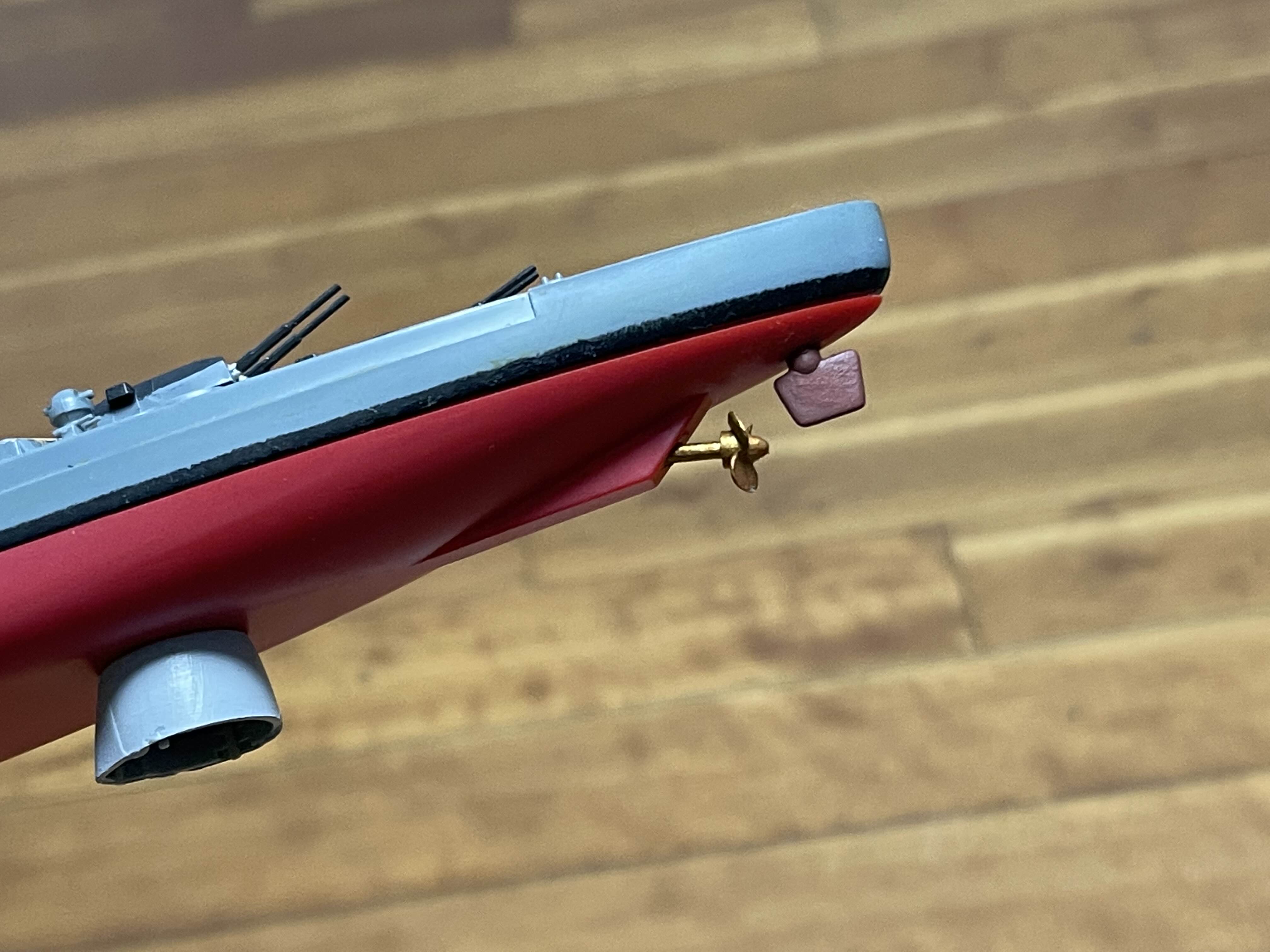 사실 어느 부분이 나무색이고 또 어떤 부분이 회색인지 명확하게 알 수가 없었는데 대략 인터넷 자료를 통해 찾은 것을 바탕으로 칠을 해 주었다. 근데 다른 작품들과 비교해보면 1/800 이라 그런지 많은 부분이 생략되어 있는것을 알 수 있었다. 특히 이렇게 원래 세 개의 프로펠러인데 1/800 모델에 한 개만 되어 있다. 그것도 뭔가 모터로 구성가능할 것 처럼 되어 있는 모습.